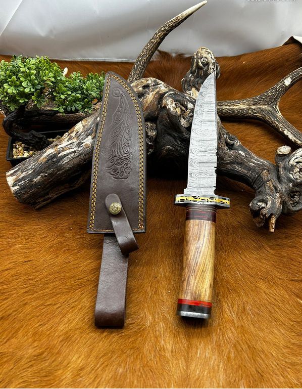 Magnifique Bowie lame en acier damas 256 couches manche en bois, Taille totales 34 taille de la lame 20 étui en cuir