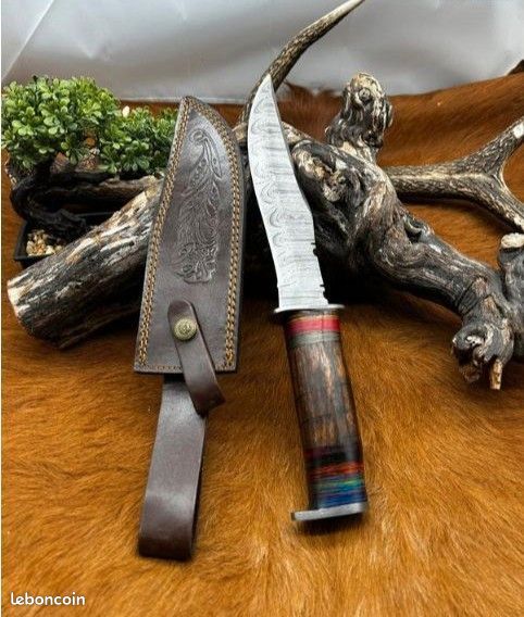 magnifique Bowie lame en acier damas 256 couches manche en bois mitre et pommeau en acier damas Taille Totales 33 cm taille de la lame 21 cm etui en cuire