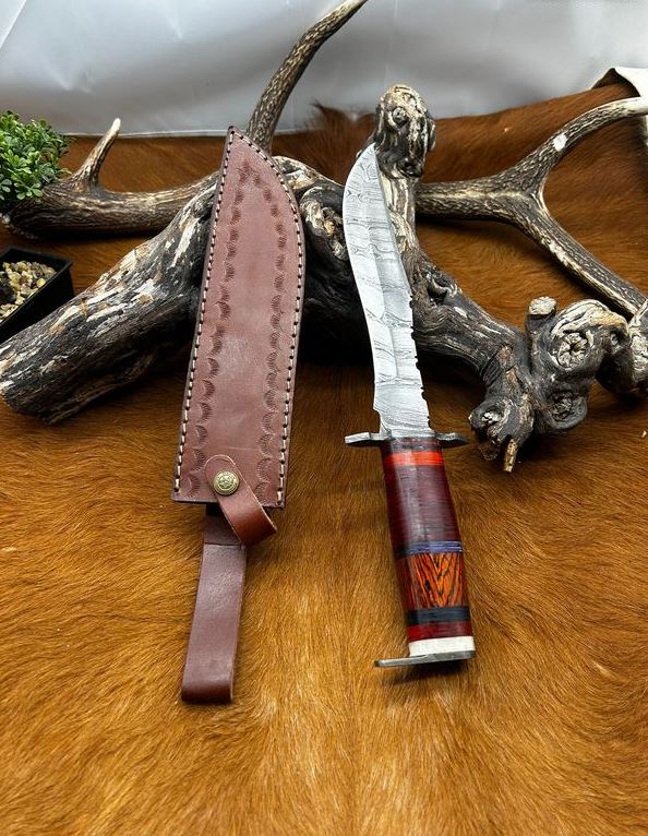 Magnifique Bowie lame en acier damas 256 couches manche en bois, garde et pommeau en acier damas Taille totales 35 taille de la lame 22 etui en cuir