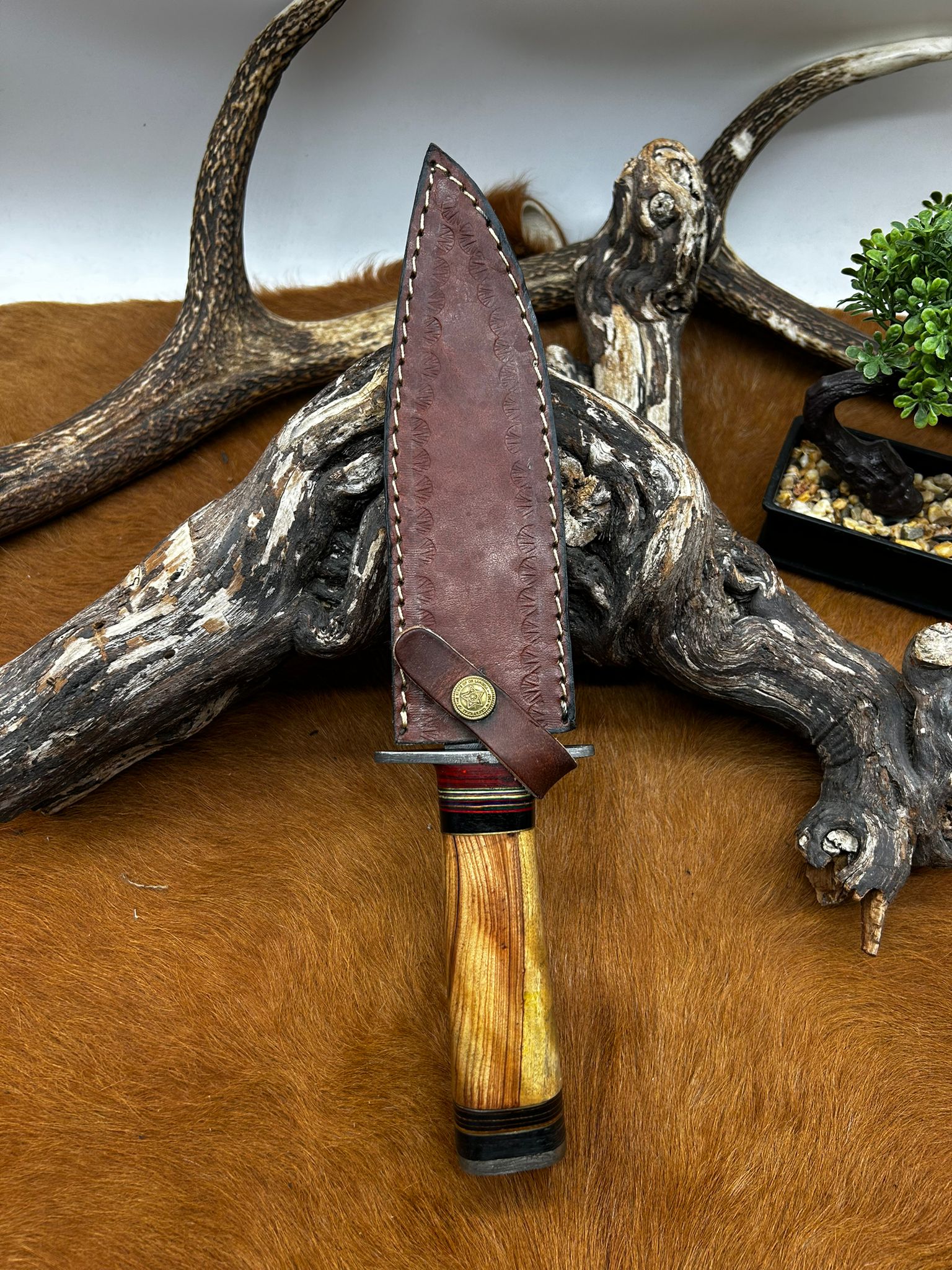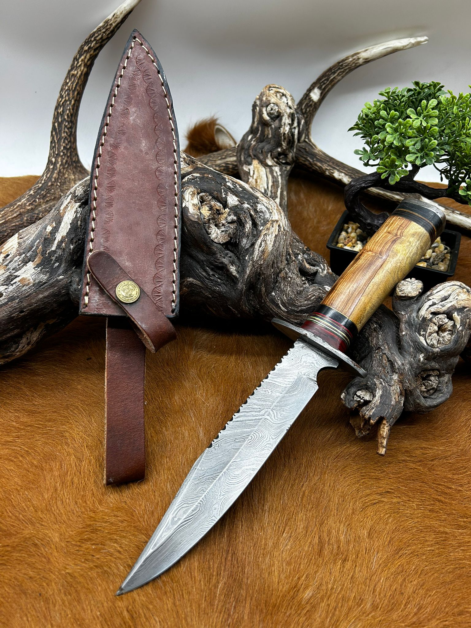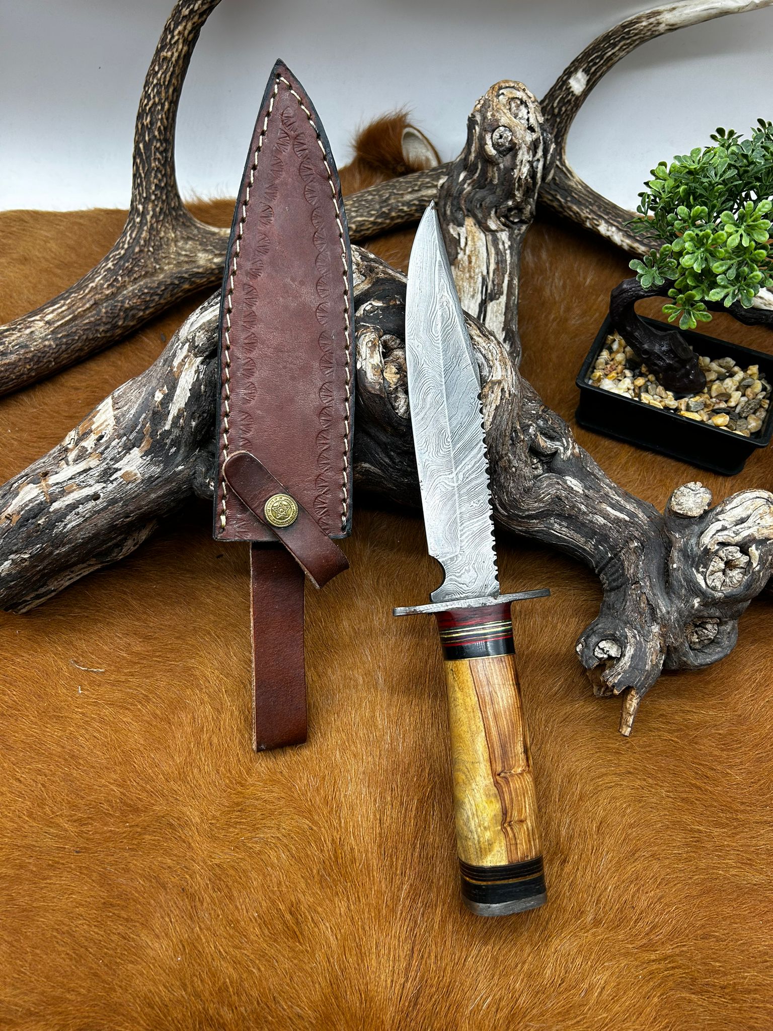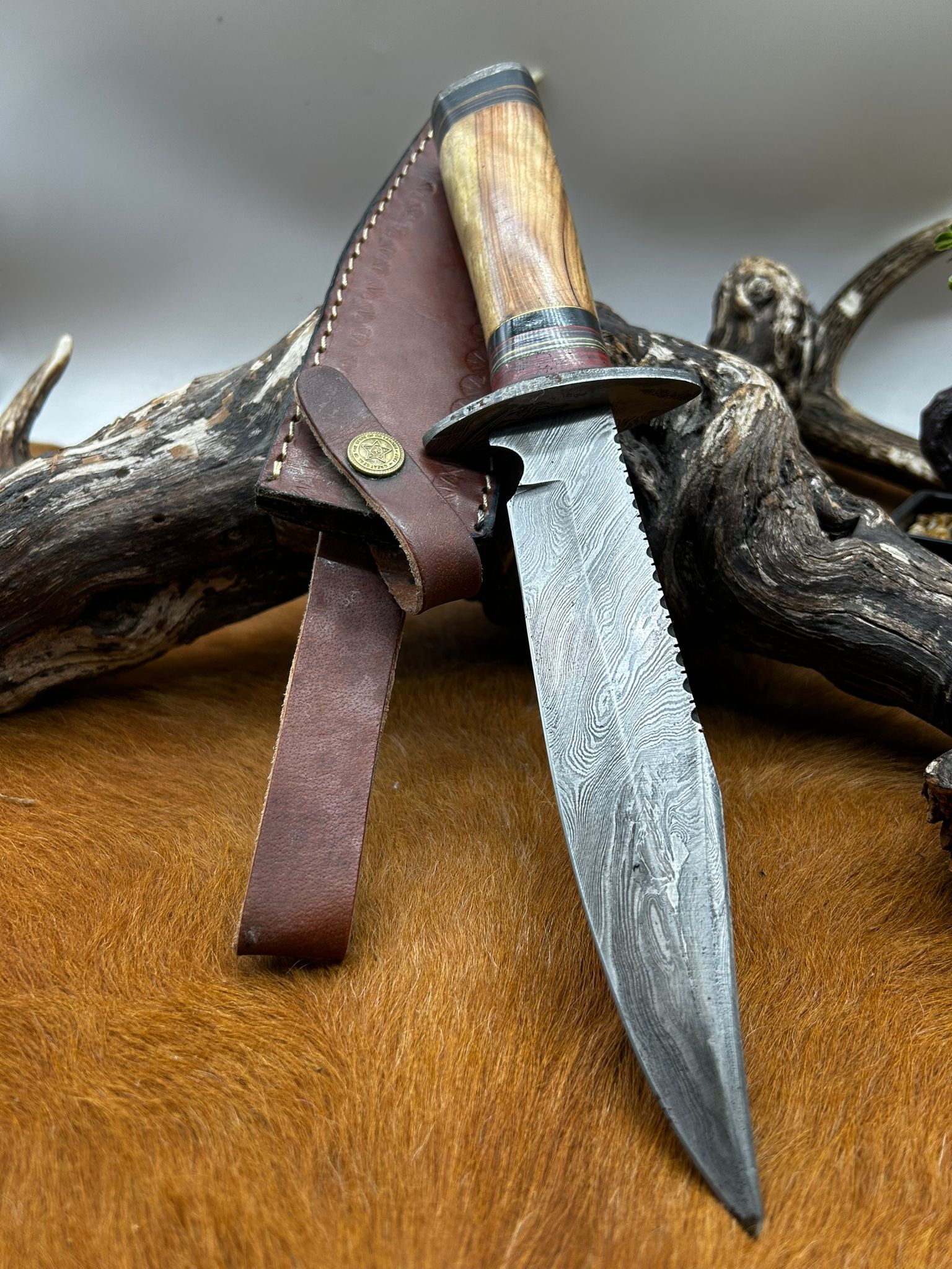 Couteau Bowie lame acier damas 256 couches manche en bois ref BC27
