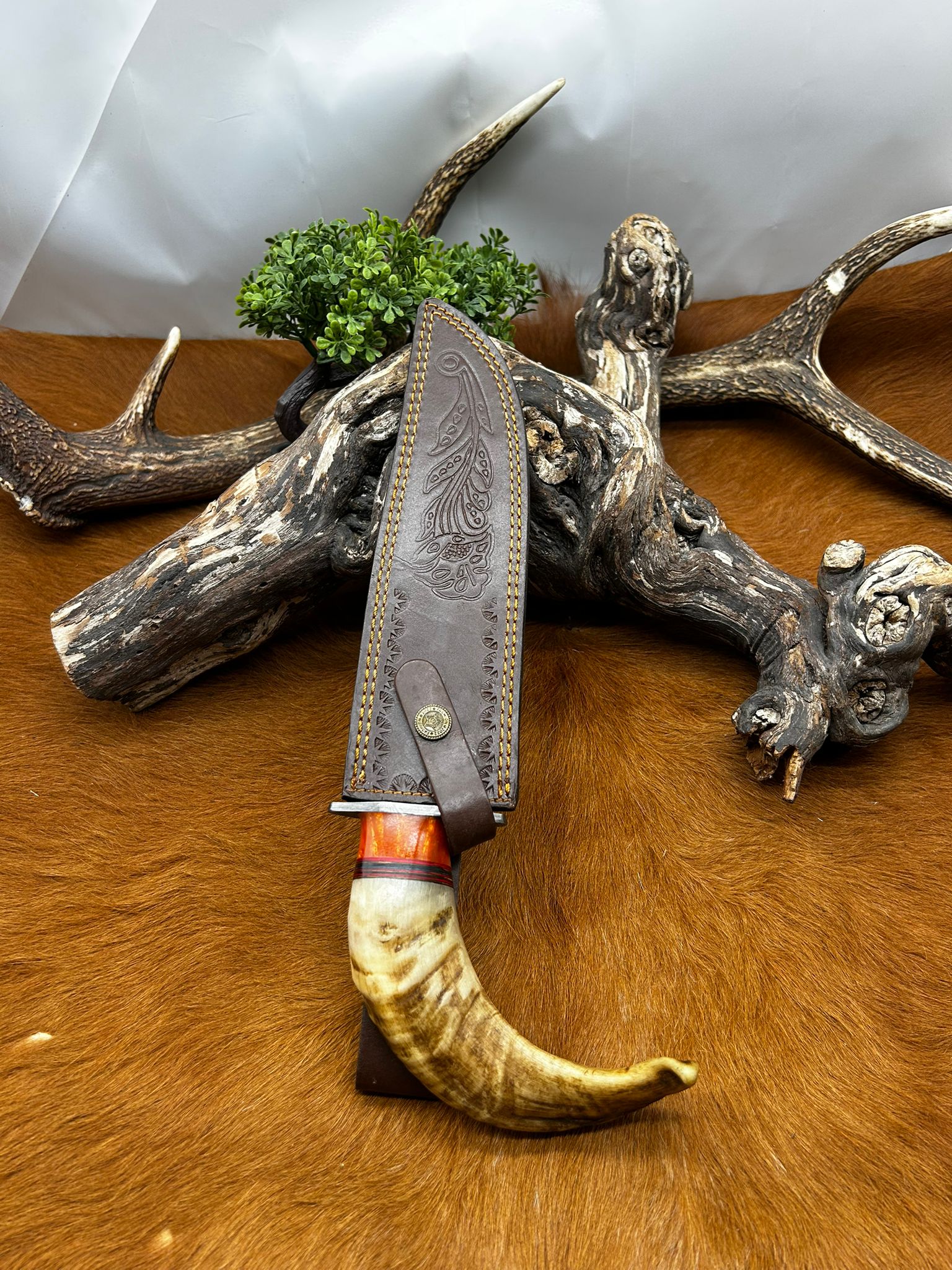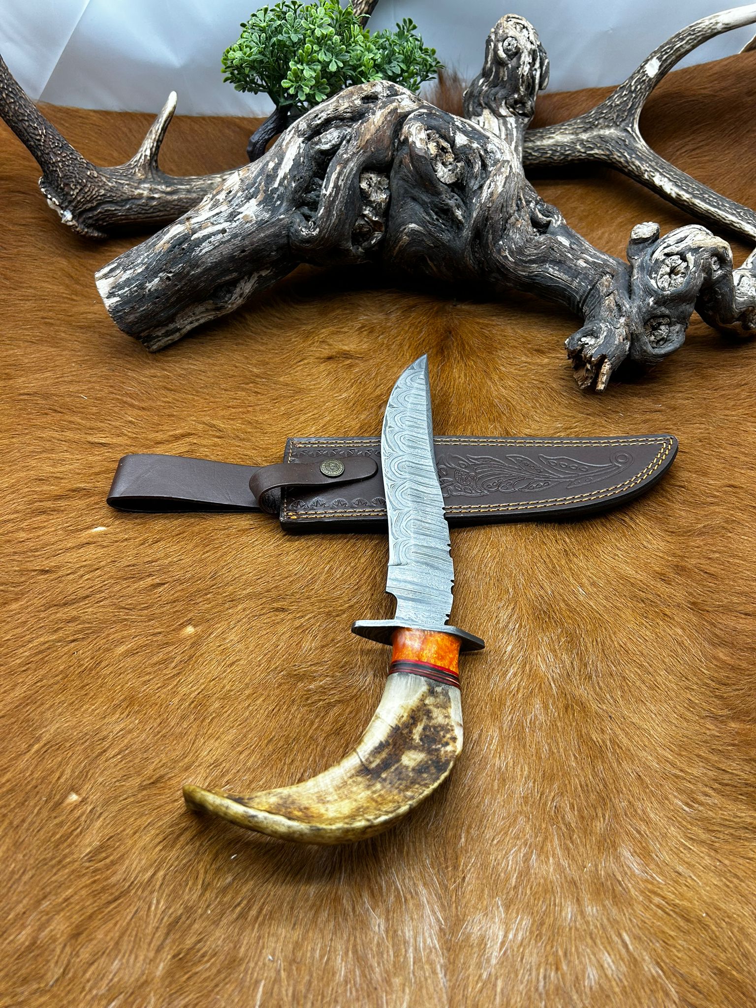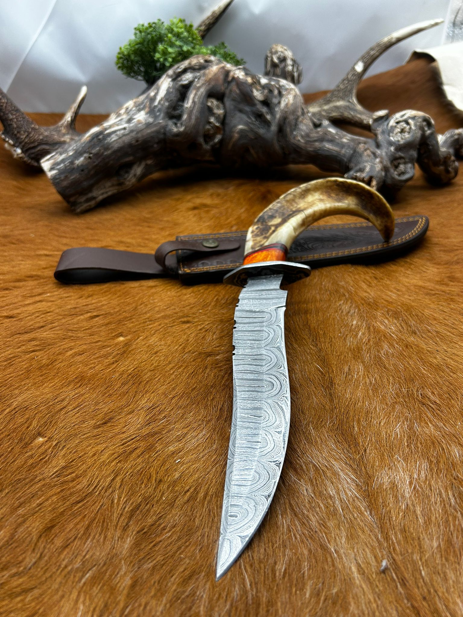 Longueur Bowie totales 30 cm taille de la lame 19 cm manche en corne de bélier garde en acier damas (voir photos magnifique travail artisanal) PIECE UNIQUE Etui cuir de vache