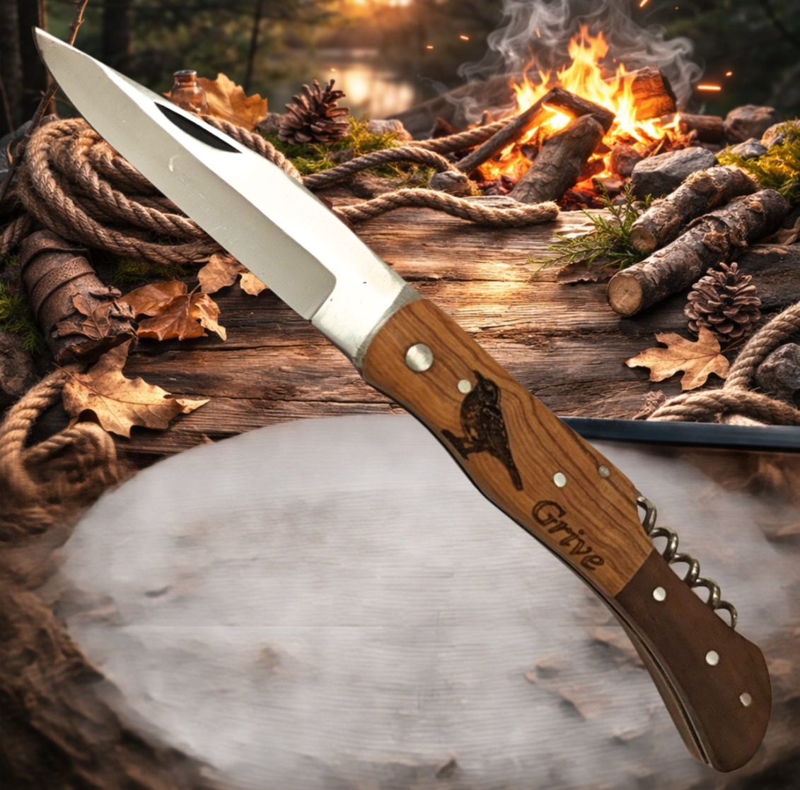 Couteau de poche Pliant manche en Bois d’Olivier Gravé Grive (Gravure Prénom Offerte) ref CPG40