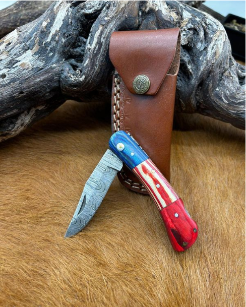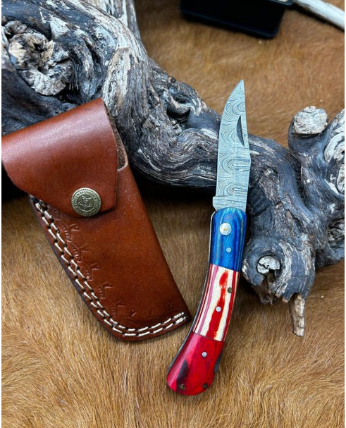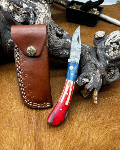 Couteau lame en acier Damas 256couches avec manche en bois pliant taille totales 18cm taille de la lame 8 cm avec etui en cuire