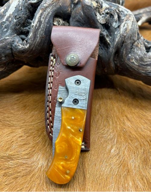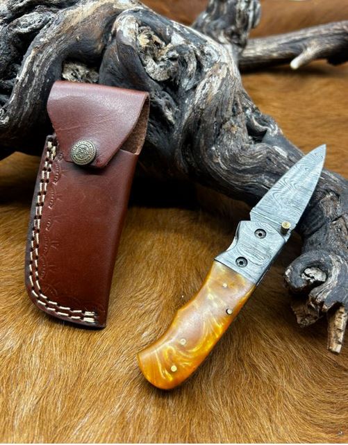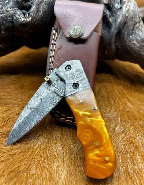 - Longueur total 18 cm - Longueur de la lame 8 cm - Lame en Acier damas 256 couches - PLIANT - Fabrication Artisanale - Les dessins de la lame sont uniques comme une empreinte - Etui en cuire