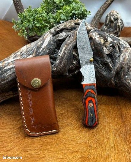 Couteau pliant lame en acier Damas 256 couches avec etui en cuire D578