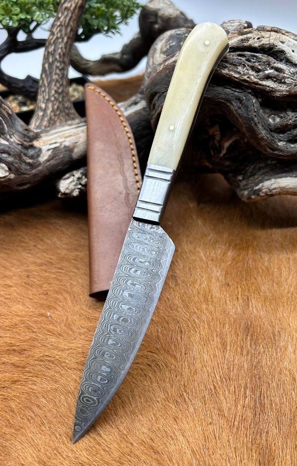 couteau vendetta lame damas 256 couches manche os avec mitre en acier taille totales 23 cm taille de la lame 12 cm avec étui en cuire