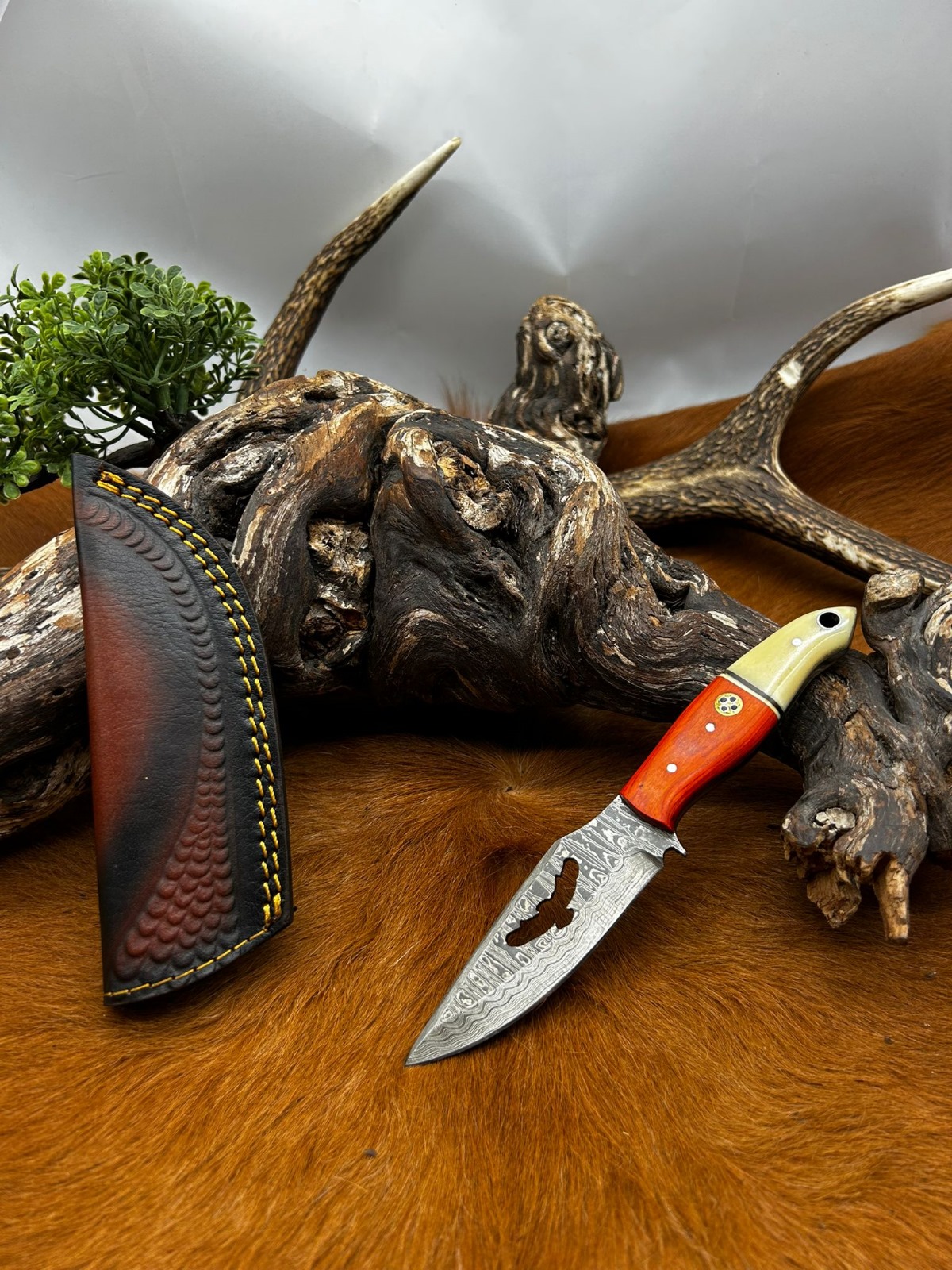 Magnifique couteau Bowie “Rite-Edge” lame acier damas manche en OS coloration imprégner avec étui en cuir ref V20
