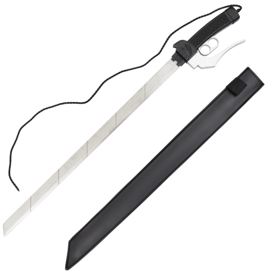 Épée fantaisie ornementale Inspirée de l'épée de L'ATTAQUE DES TITAN Lame en acier Fourreau en similicuir Longueur de la lame : 670 mm Longueur totale : 880 mm (930 mm avec le fourreau) Poids : 1 360 g (1 490 g avec le fourreau)