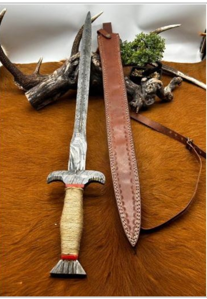 Épée médiévale avec lame acier Damas 512 couches garde et pommeau en acier damage 128 couches Manche en corde de joute Étui en cuire de vache avec attache à l’épaule taille totales 85 cm taille de la lame 65 cm