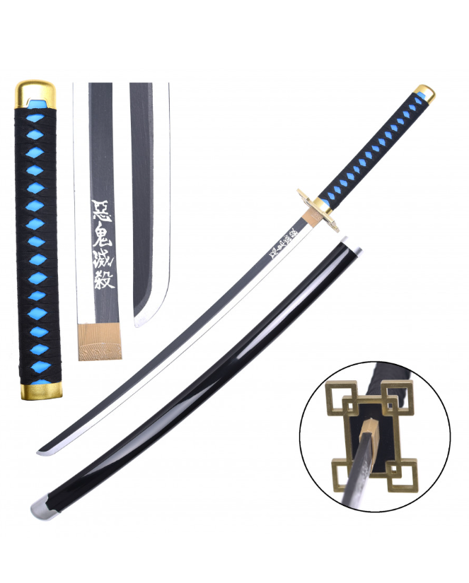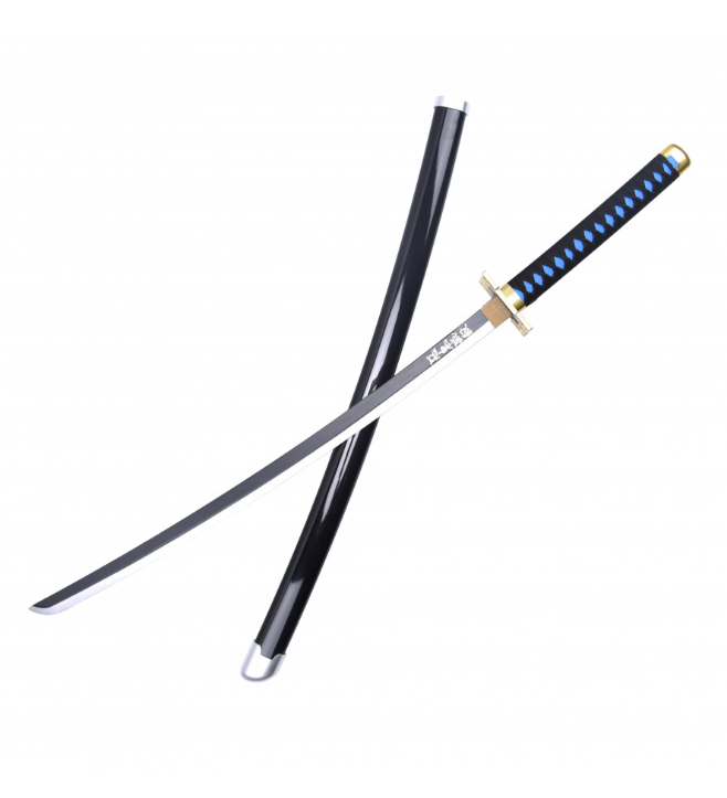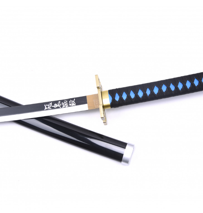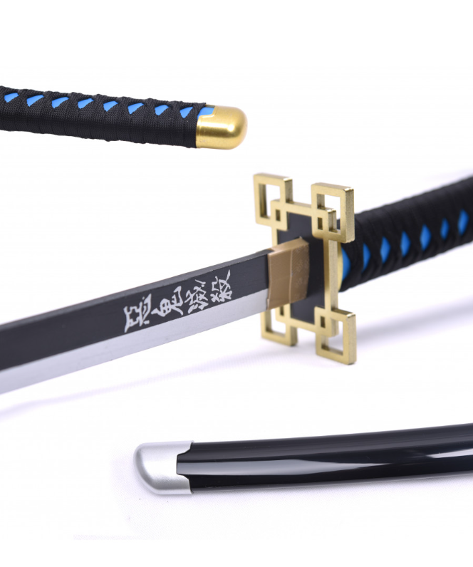 katana manga lame en bois noir et blanc avec kanjis calligraphiés en blanc, saya noir, tsuba de forme géométrique (carrés imbriqués), tsuka noir et bleu.