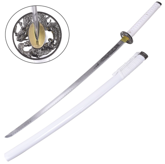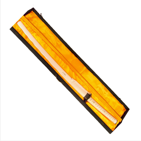 KATANA ORNEMENTAL LONGUEUR TOTALE 1030 mm LONGUEUR TOTALE DE LA LAME 680 mm LAME EN ACIER CARBONE FOURREAU ET TSUKA EN BOIS TSUBA EN MÉTAL LIVRÉ AVEC SON ÉTUI EN BOIS ENVELOPPÉ DE SOIE