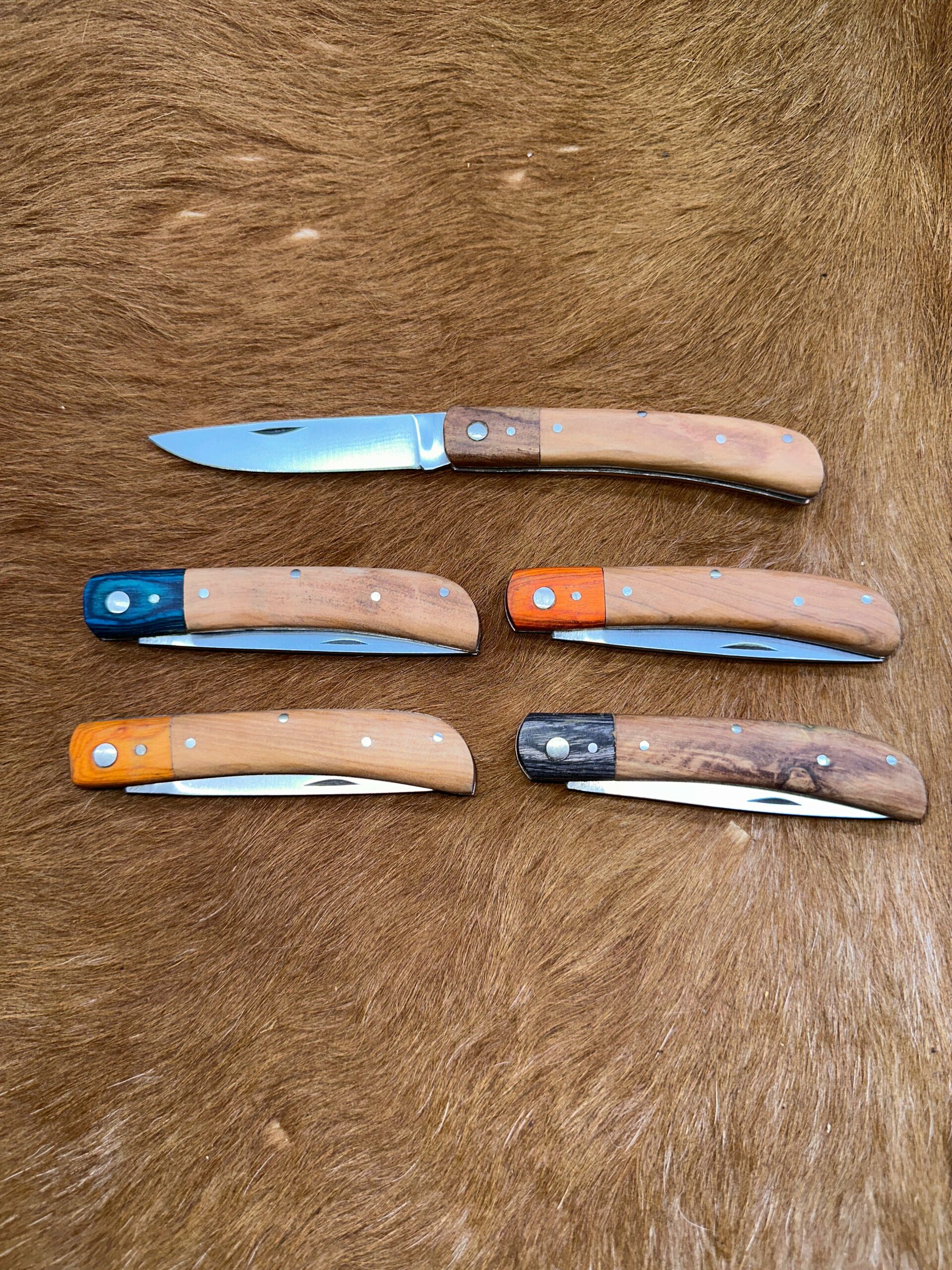 Lot de 5 couteaux de poche manche bois olivier Ref G008 avec gravure prénom