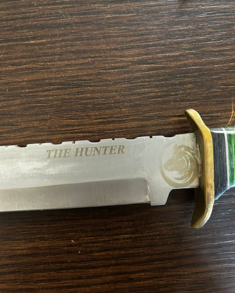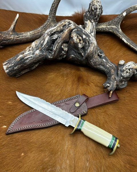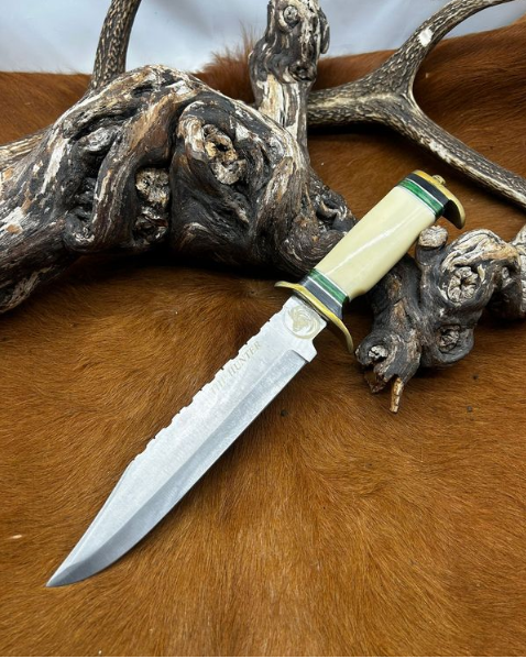 Magnifique Bowie "THE HUNTER", avec tête de sanglier gravé sur la lame Manche en OS garde et pommeau en laiton Taille totale : 33 cm Taille de la lame : 22 cm Etui en cuir