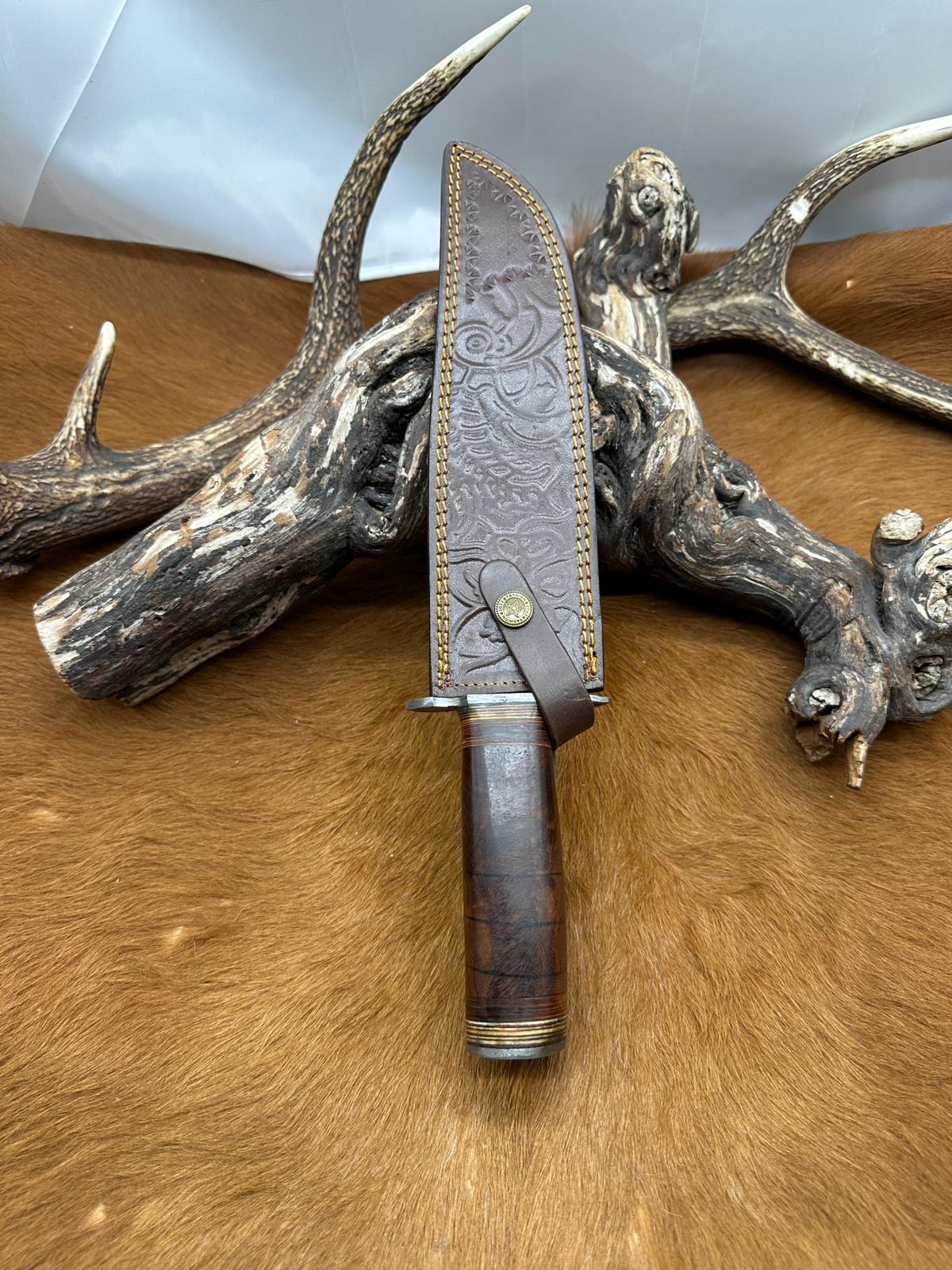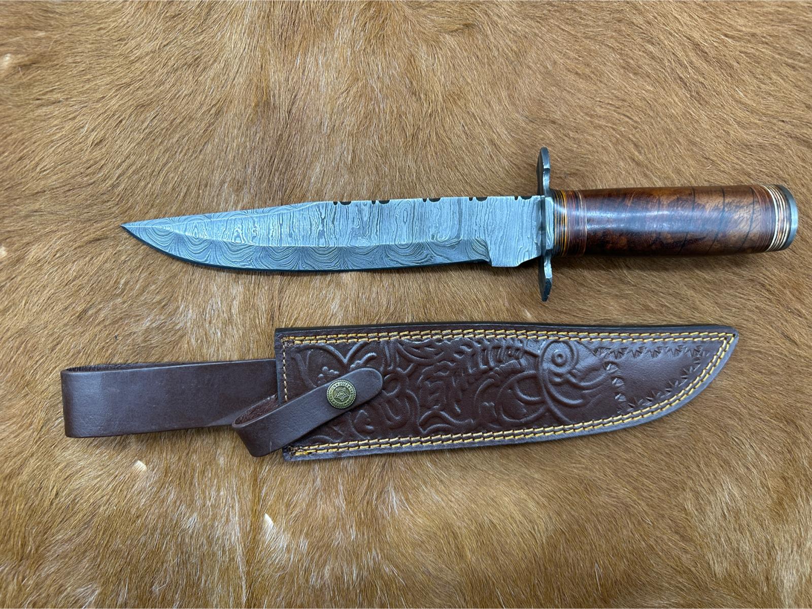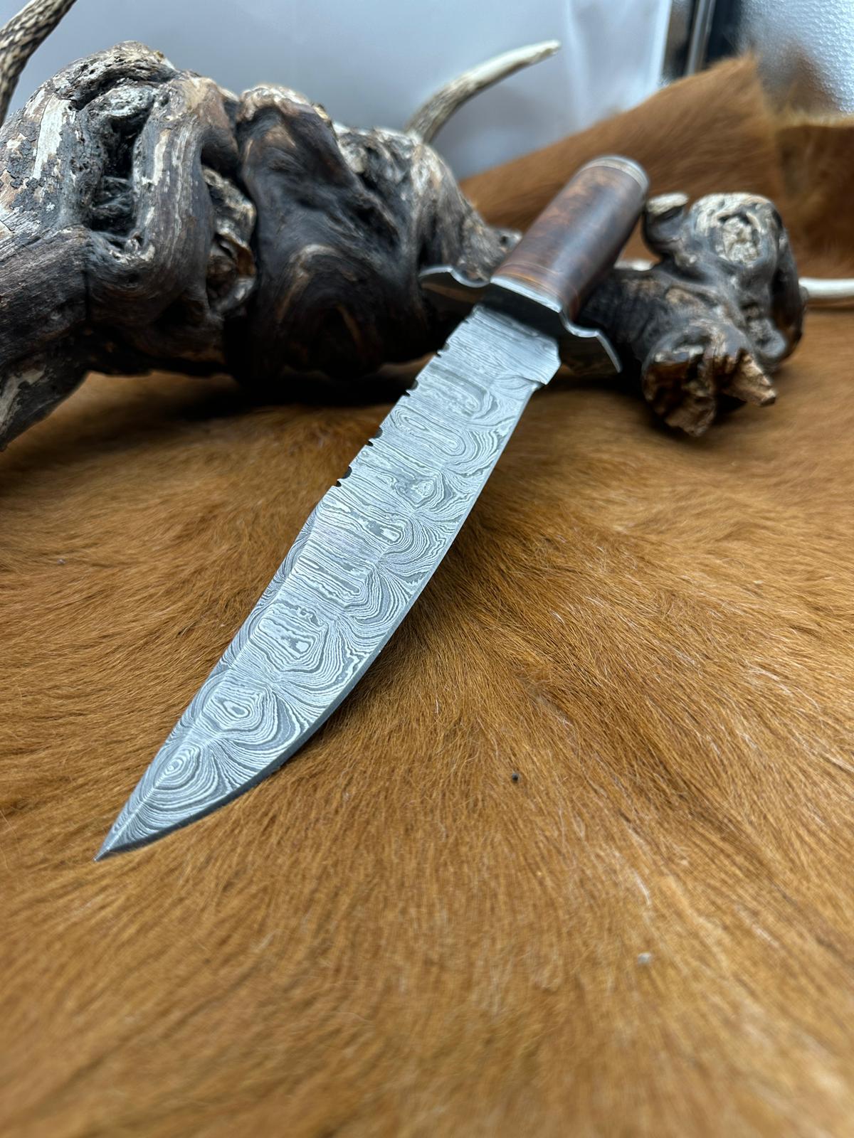 Couteau Bowie lame en acier damassé, aux motifs ondulés bien marqués, offre une excellente capacité de coupe tout en apportant un rendu visuel unique à chaque pièce.