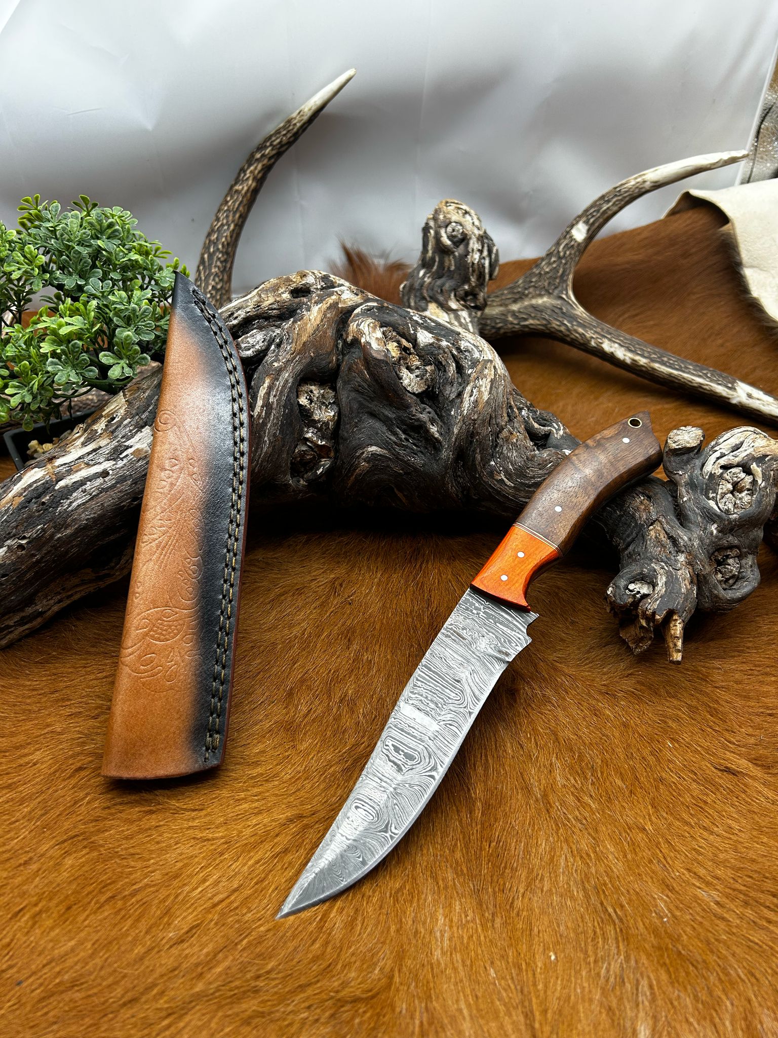 Magnifique Couteau lame en acier Damas 256 couches manche en Bois d’Olivier et pommeau en bois de cerf ref B153