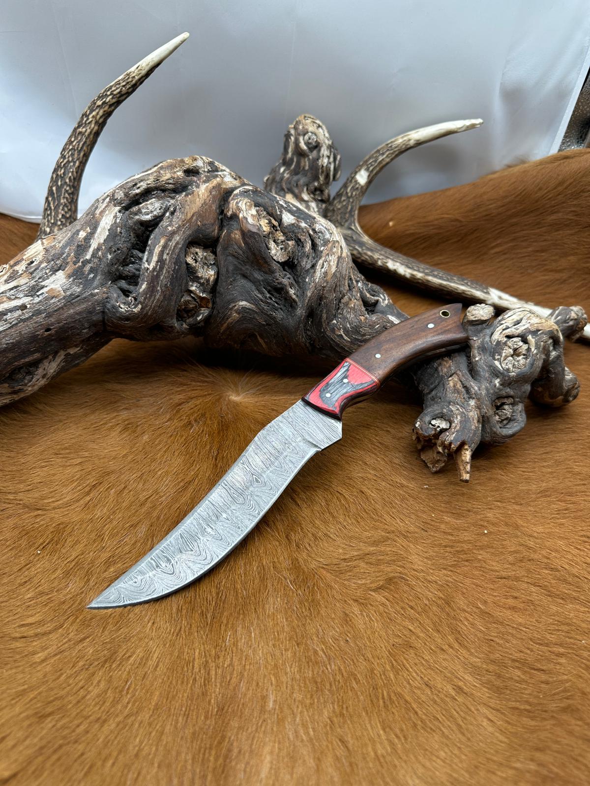 Lame : lame en acier damassé, aux motifs fluides et élégants, révélant un travail artisanal précis. Elle offre un tranchant performant, durable et parfaitement adapté à un usage outdoor, chasse ou collection.