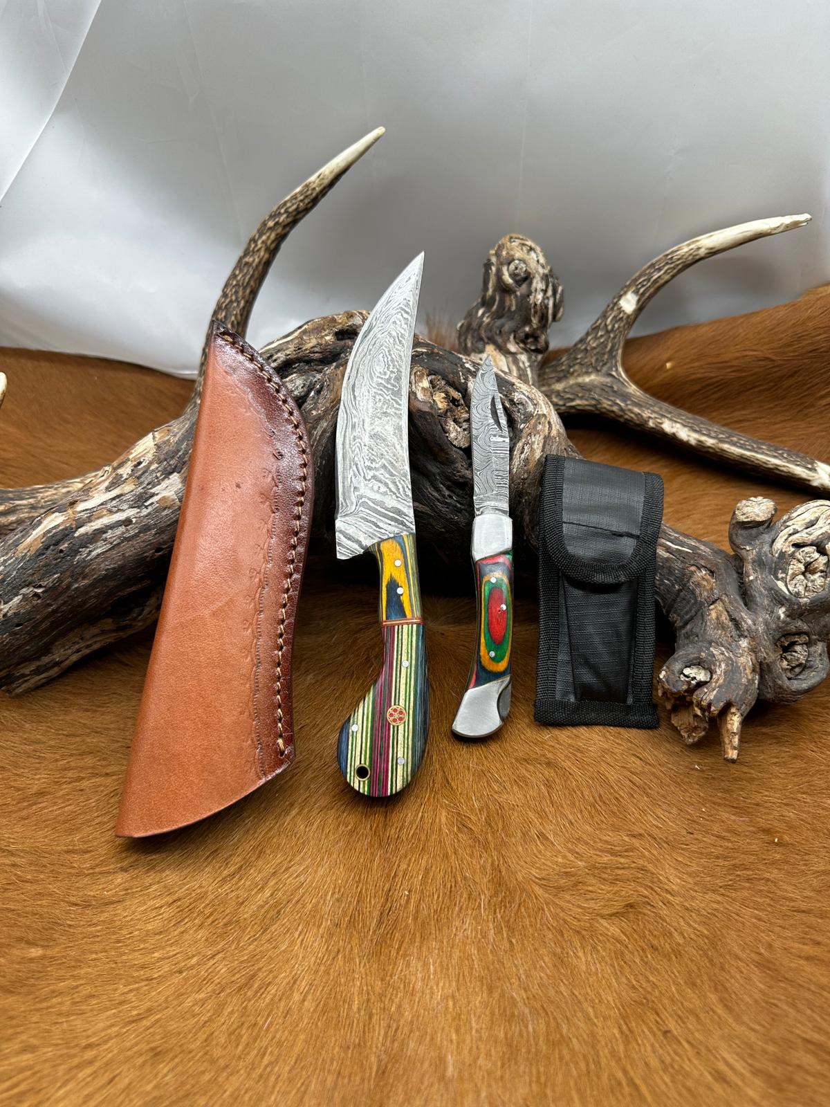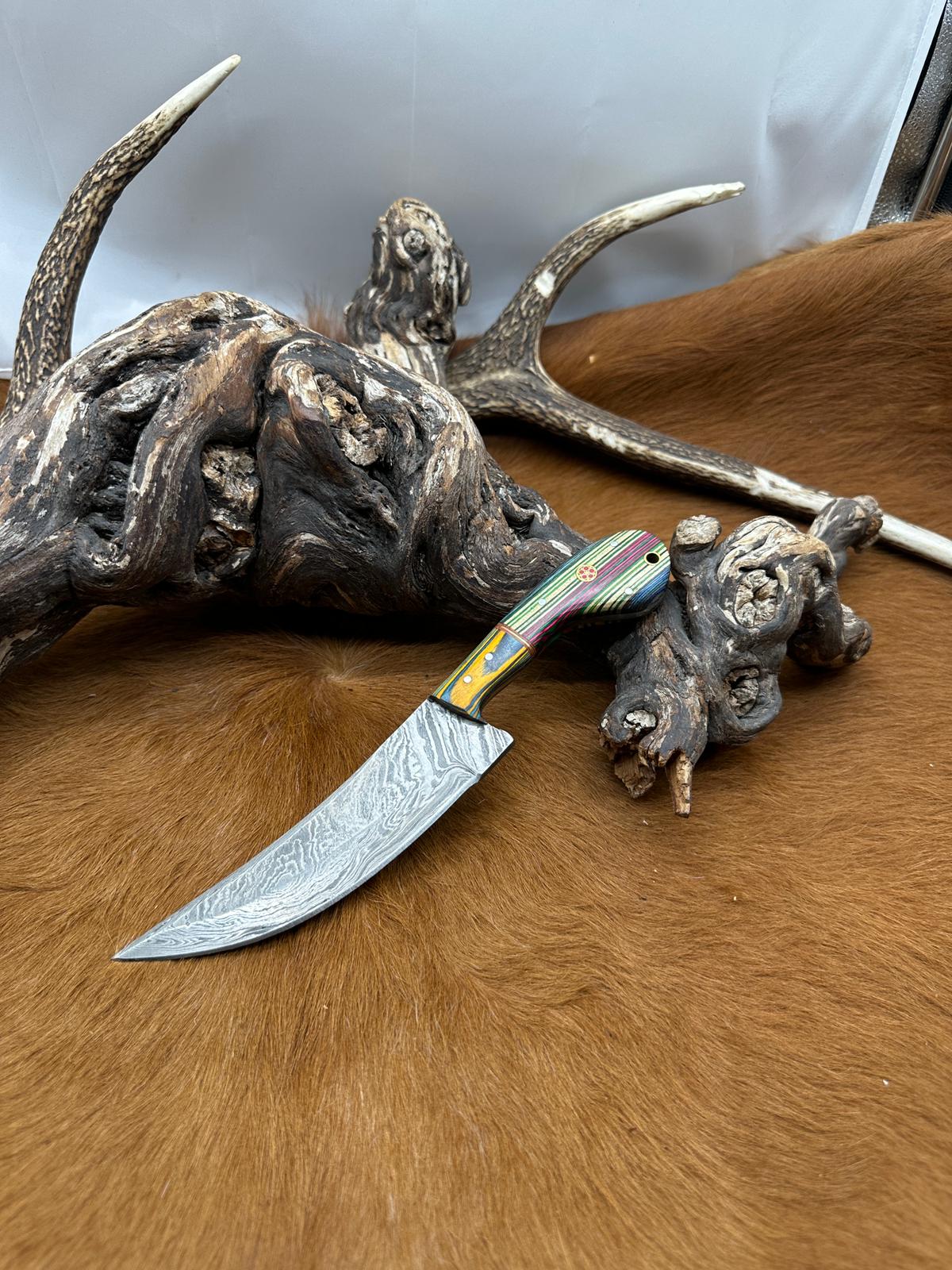 Lame : lame en acier damas, reconnaissable à ses motifs ondulés caractéristiques. Elle offre une excellente capacité de coupe, une bonne tenue du tranchant et un rendu visuel unique. Sa forme polyvalente la rend adaptée aussi bien à l’usage outdoor qu’à la collection.