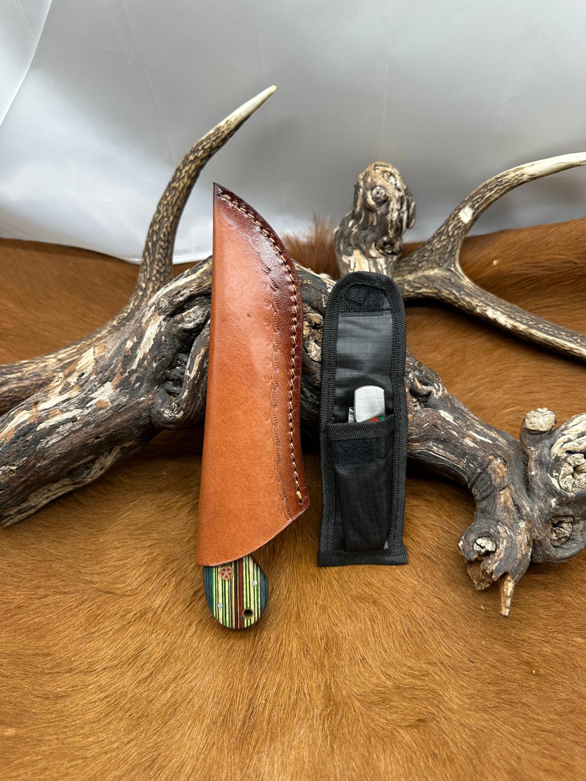 Étui : livré avec un étui en cuir épais, cousu et embossé, parfaitement ajusté à la lame. Il permet un port sécurisé à la ceinture et protège efficacement le couteau.