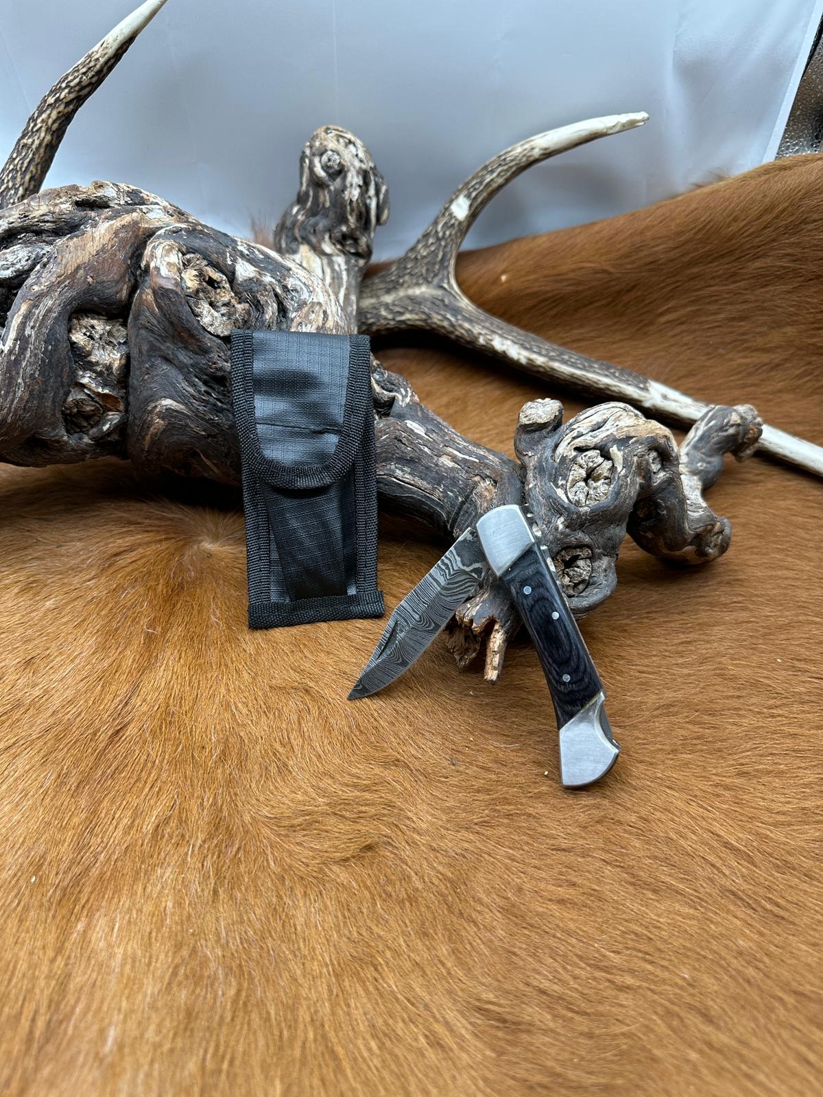 Lame : lame en acier damas, reconnaissable à ses motifs ondulés caractéristiques. Elle offre une excellente capacité de coupe, une bonne tenue du tranchant et un rendu visuel unique. Sa forme polyvalente la rend adaptée aussi bien à l’usage outdoor qu’à la collection.