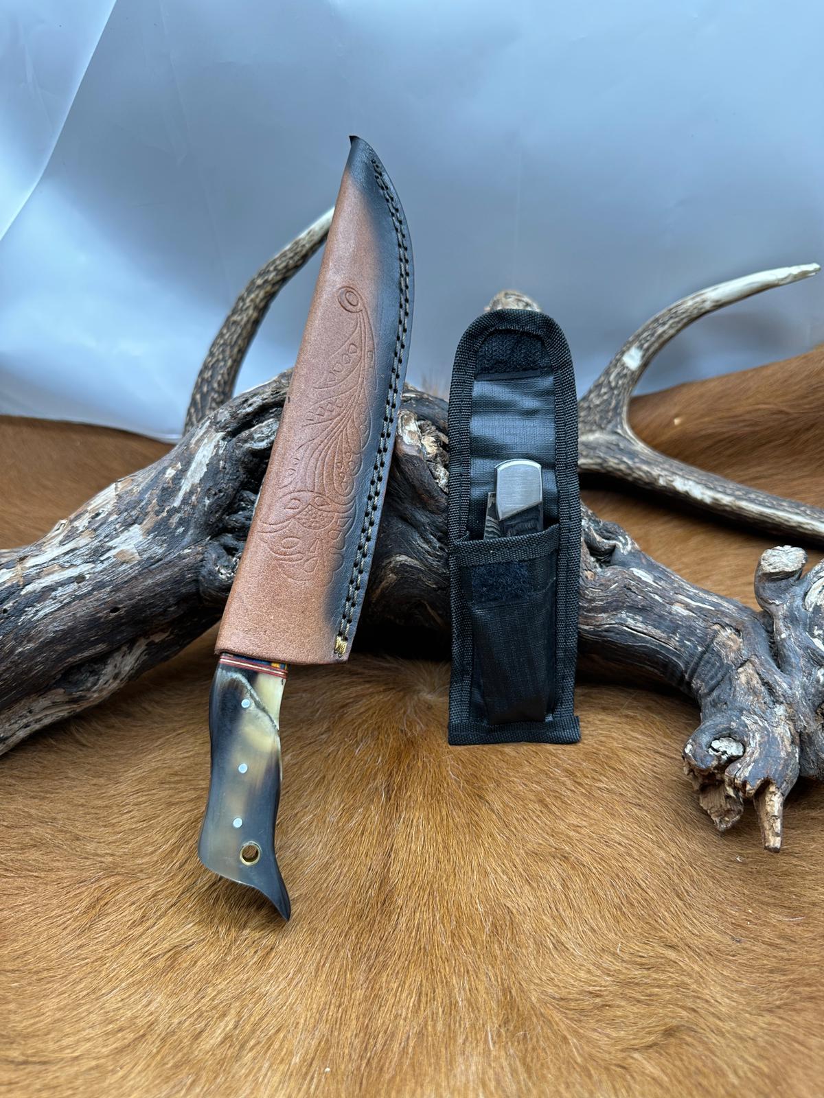 Étui : livré avec un étui en cuir épais, cousu et embossé, parfaitement ajusté à la lame. Il permet un port sécurisé à la ceinture et protège efficacement le couteau.