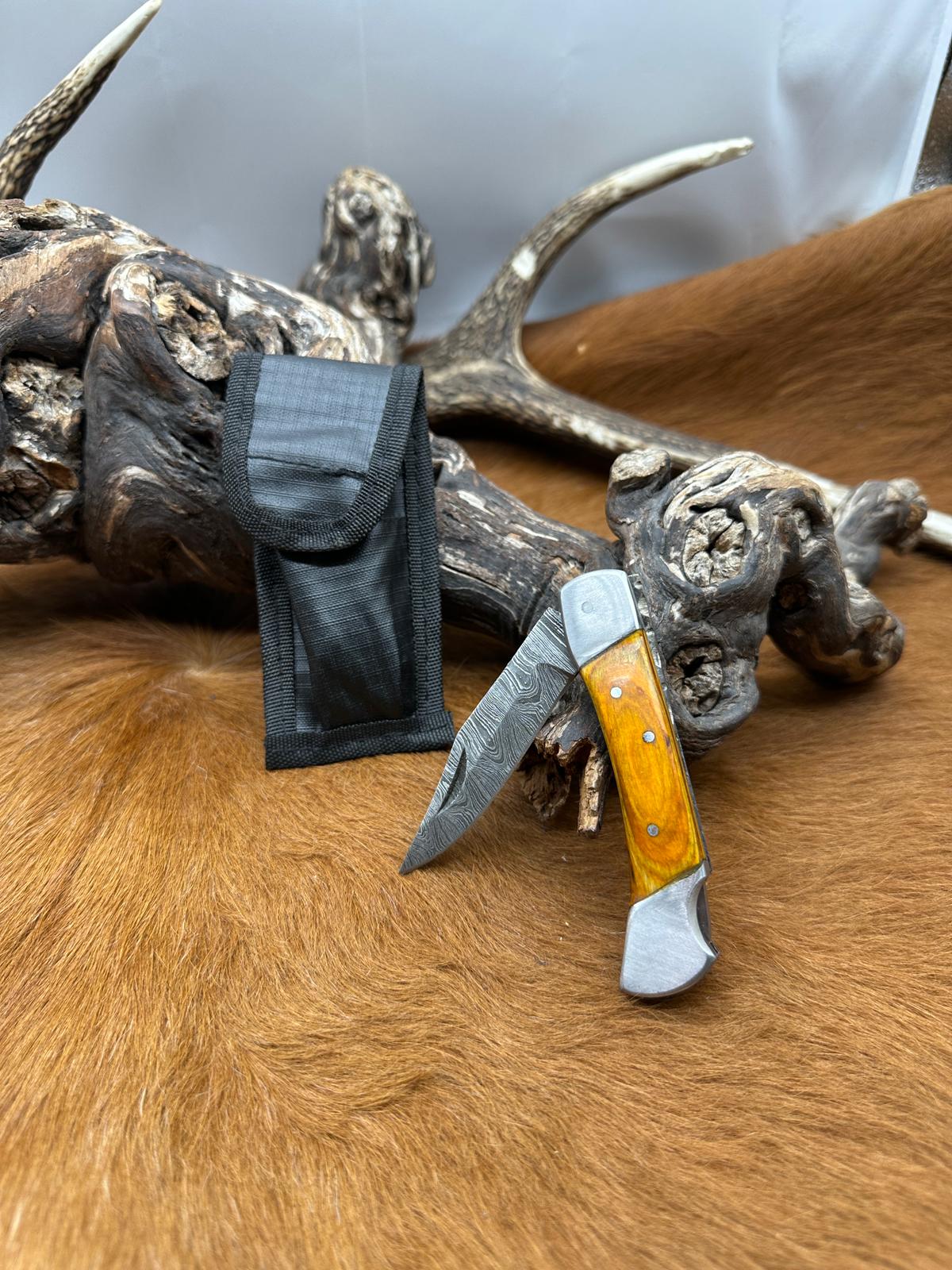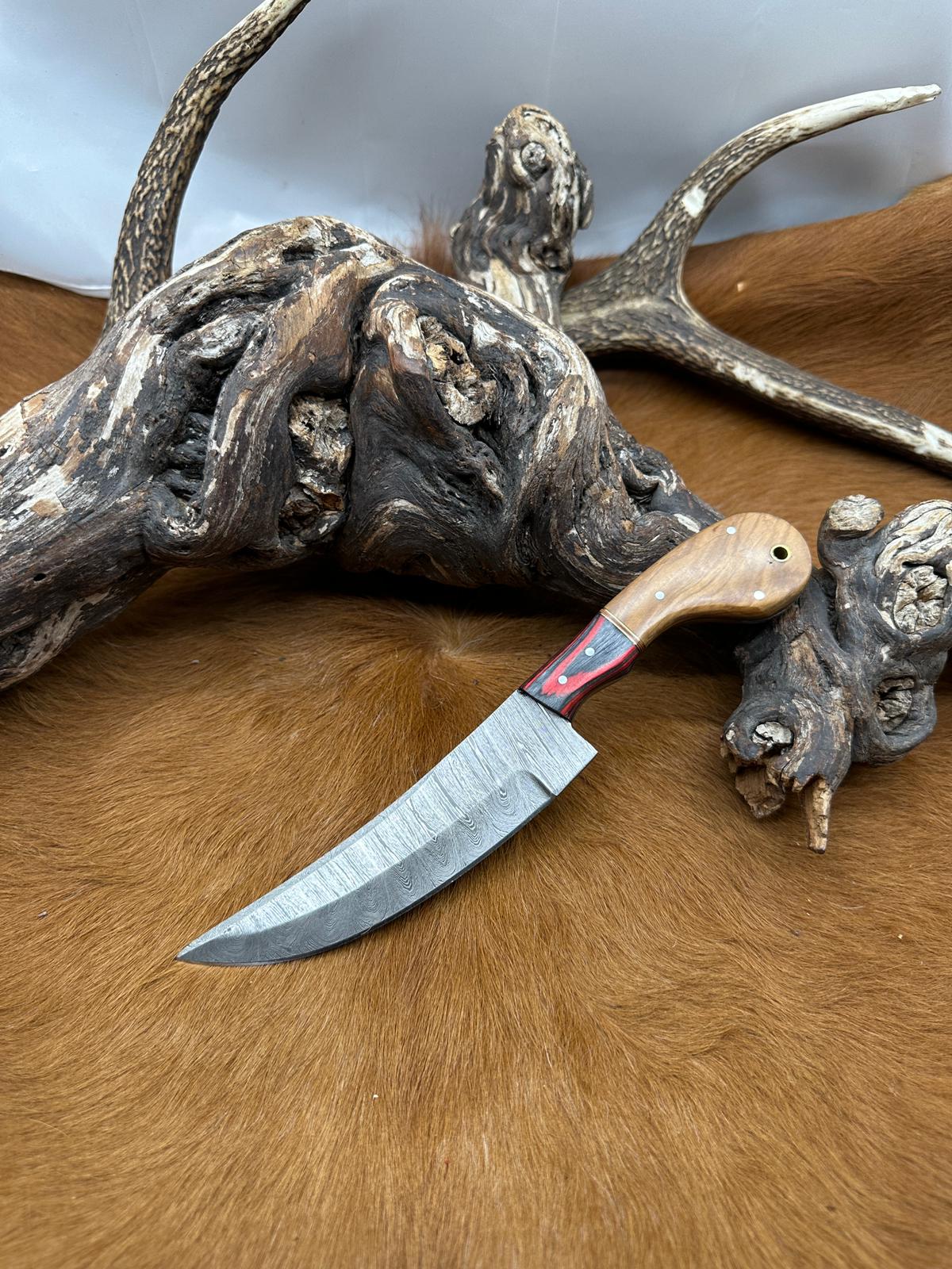 Lame : lame en acier damas, reconnaissable à ses motifs ondulés caractéristiques. Elle offre une excellente capacité de coupe, une bonne tenue du tranchant et un rendu visuel unique. Sa forme polyvalente la rend adaptée aussi bien à l’usage outdoor qu’à la collection.