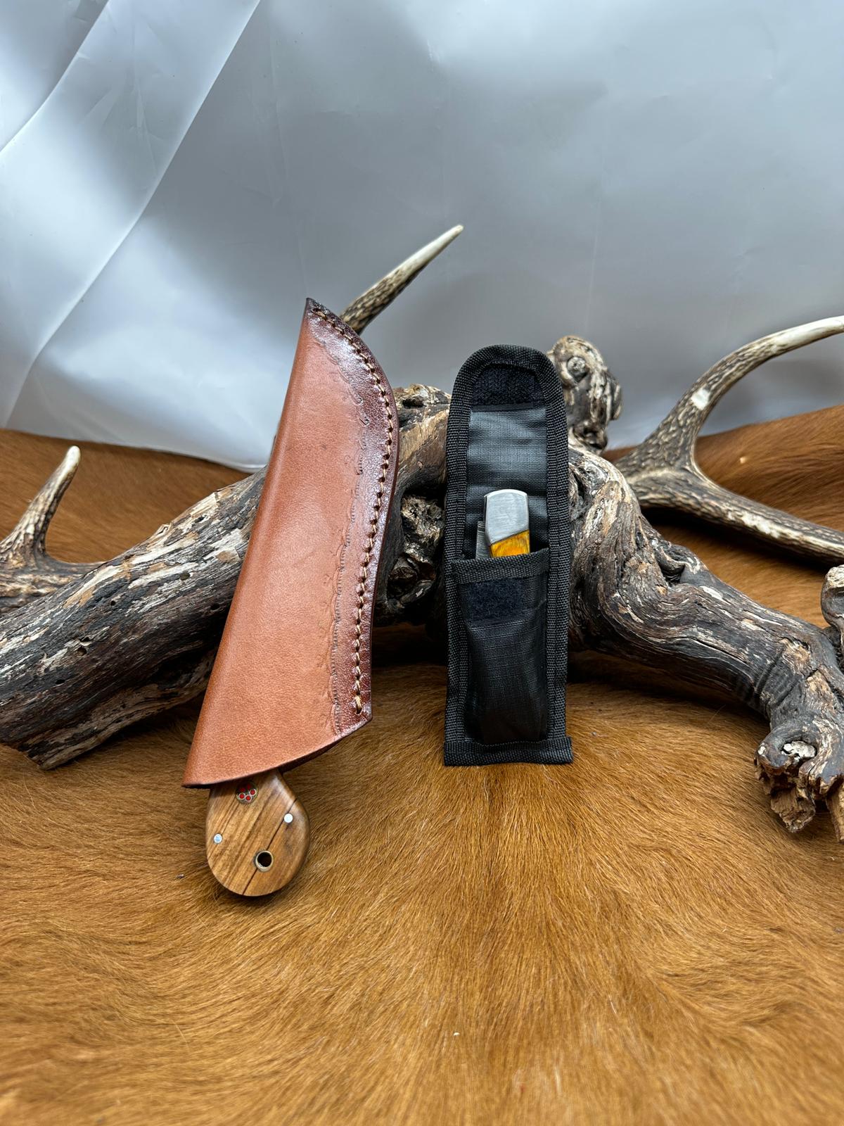 Étui : livré avec un étui en cuir épais, cousu et embossé, parfaitement ajusté à la lame. Il permet un port sécurisé à la ceinture et protège efficacement le couteau.