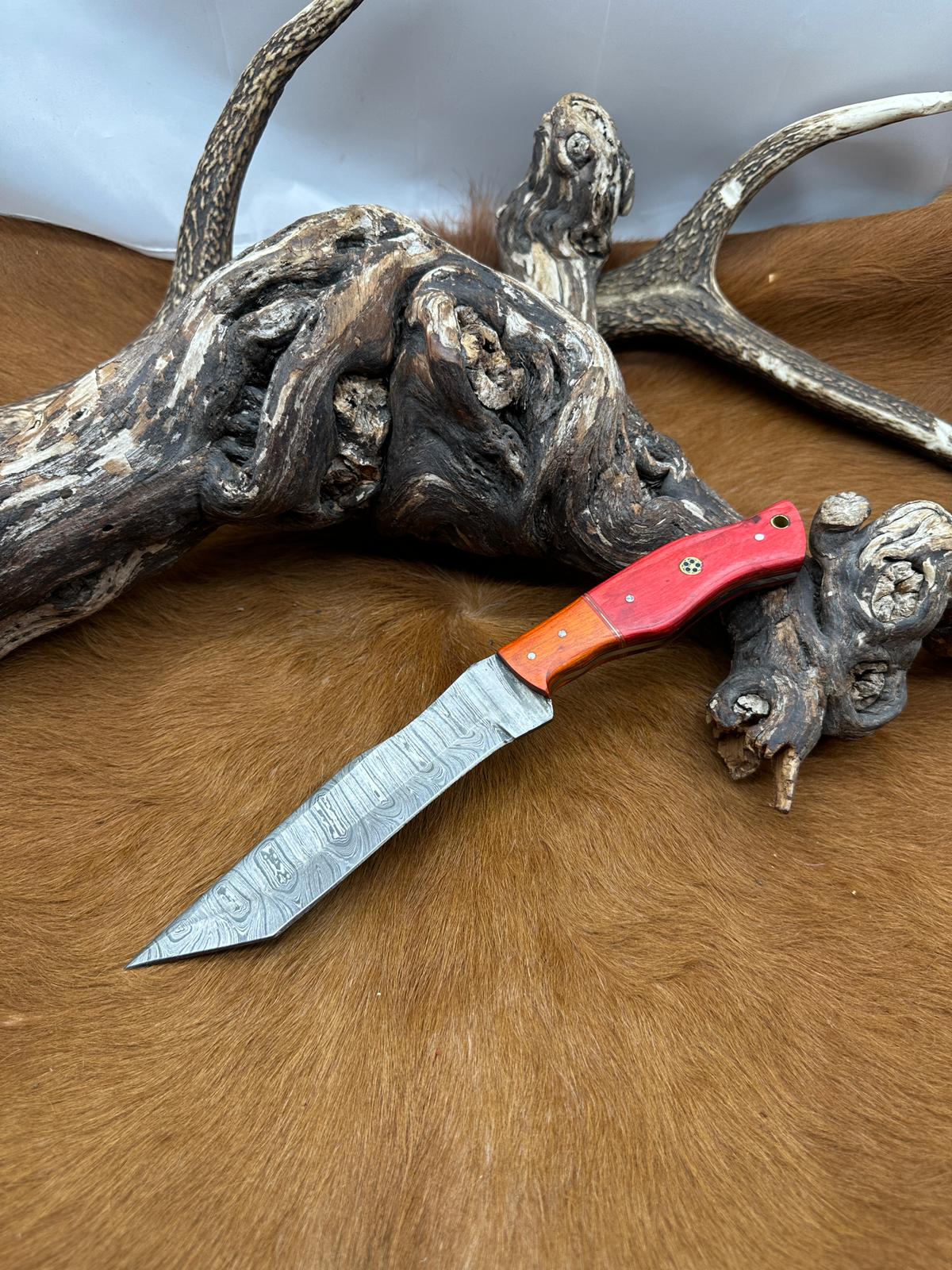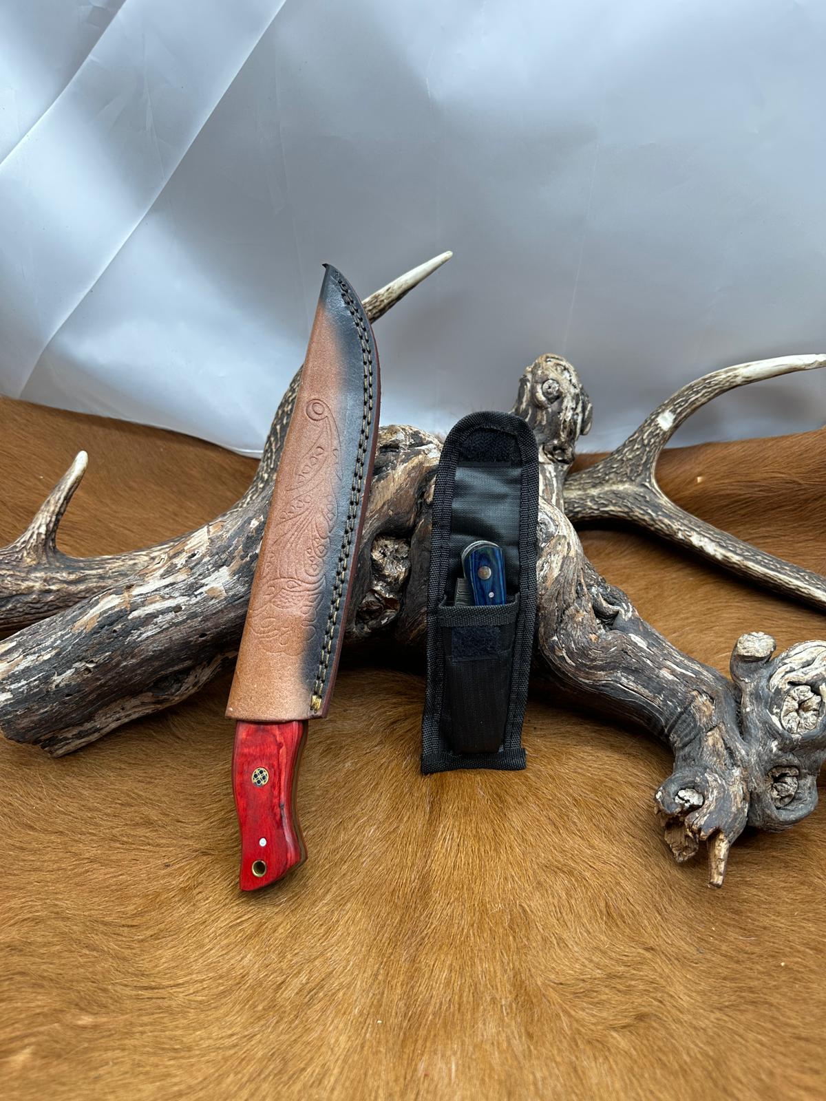 Belle dague + Couteau à dépecer lame damas 256Couches manche Bois étui cuir RITE-EDGE USA D570