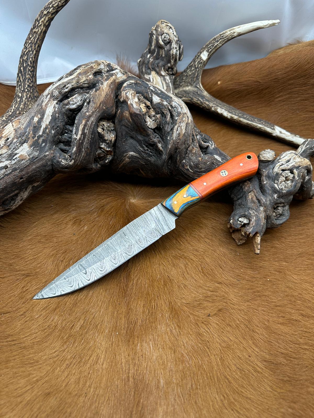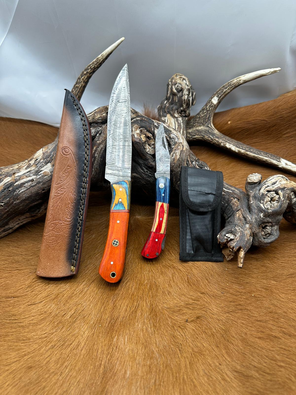 Lot de 2 couteaux lame fixe Damas 256 couches en bois coloré et en noyer ref D26