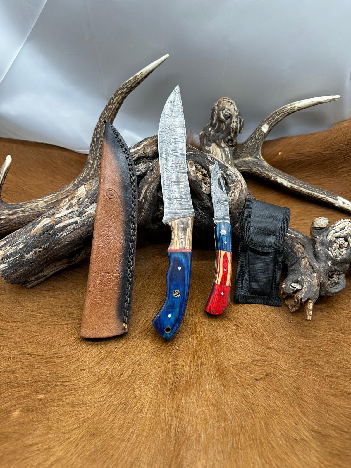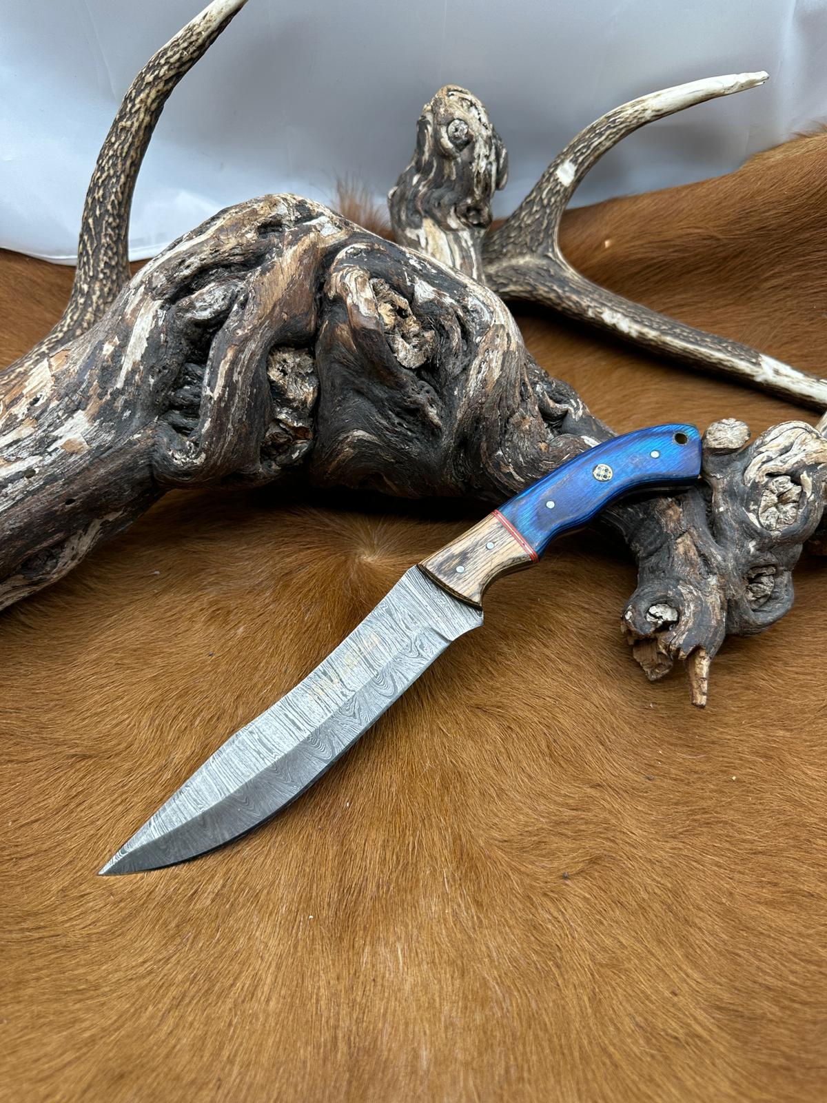 Lame : lame en acier damas, reconnaissable à ses motifs ondulés caractéristiques. Elle offre une excellente capacité de coupe, une bonne tenue du tranchant et un rendu visuel unique. Sa forme polyvalente la rend adaptée aussi bien à l’usage outdoor qu’à la collection.