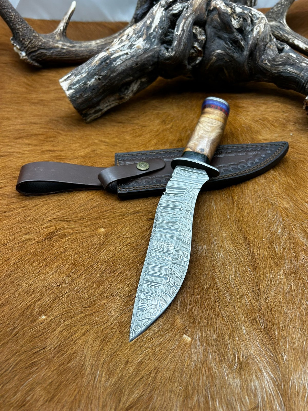 Couteau chasse lame damas 256 couches Manche en bois d’olivier coloré ref D114