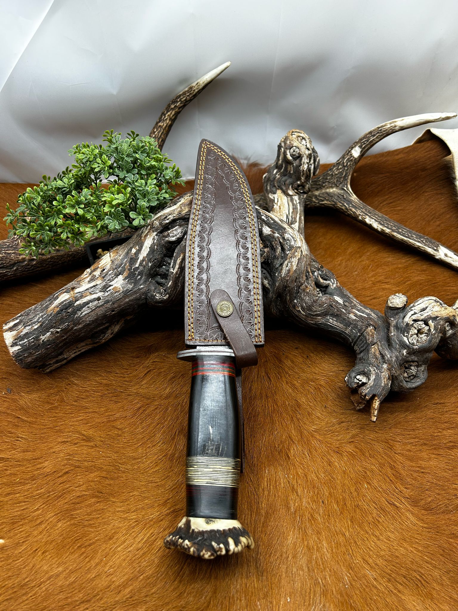 Magnifique couteau lame en acier Damas 256 couches manche en corne et pommeau en bois de cerf Travail artisanal Taille totales 35 cm Taille de la lame 20 cm Taille du manche 15 cm Étui en cuire de vache