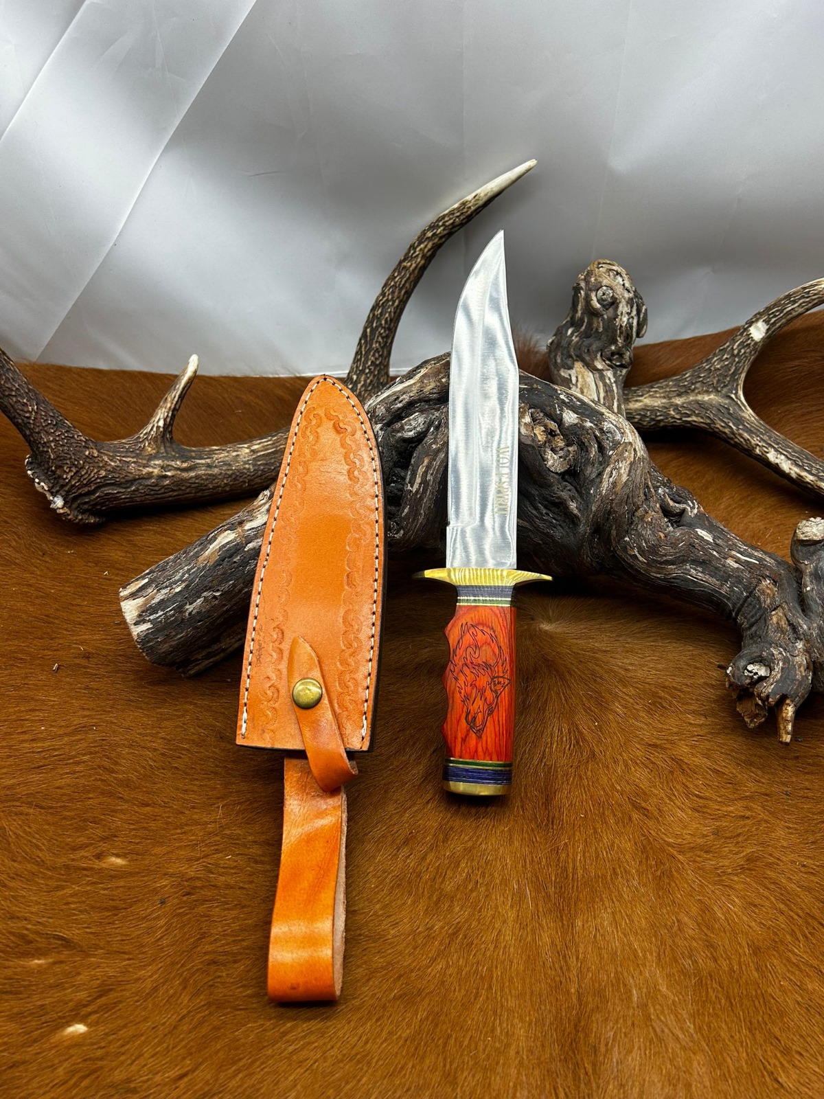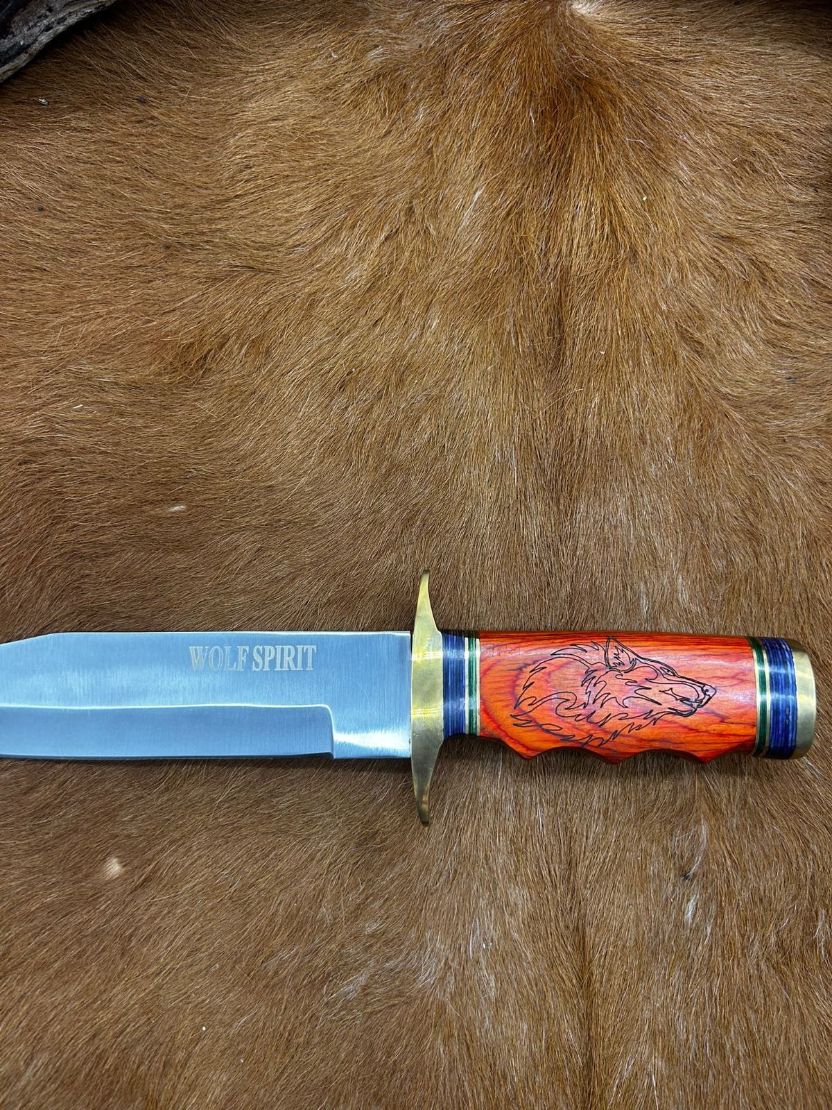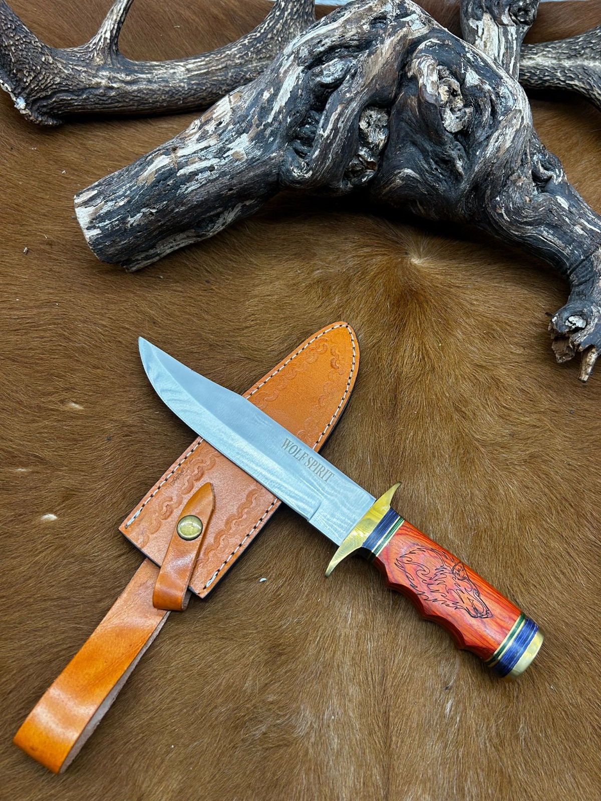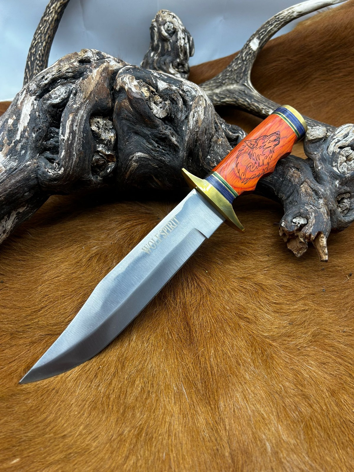 manche en bois avec un loup gravé