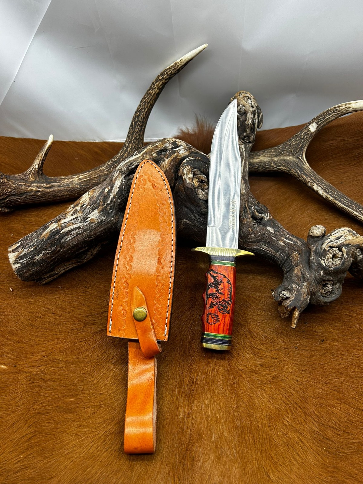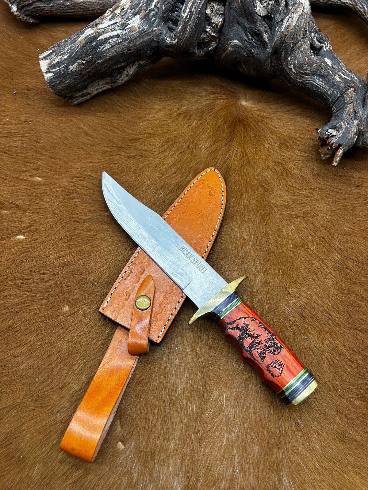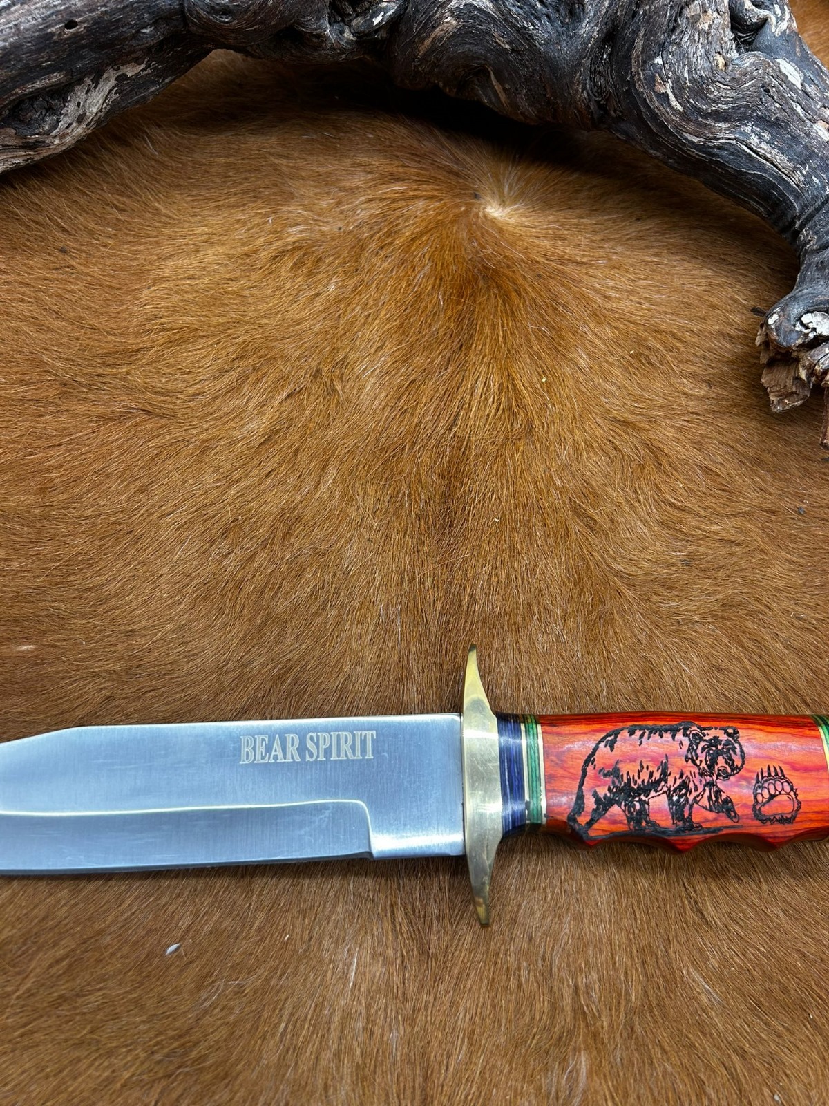 Magnifique couteau lame fixe avec un ours gravé sur le manche ref P205