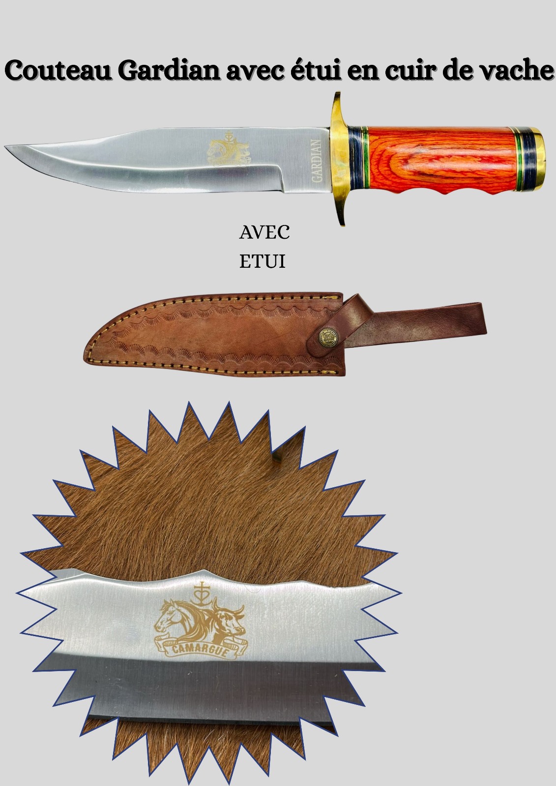Magnifique couteau lame fixe avec Camargue et gardian gravé sur la lame