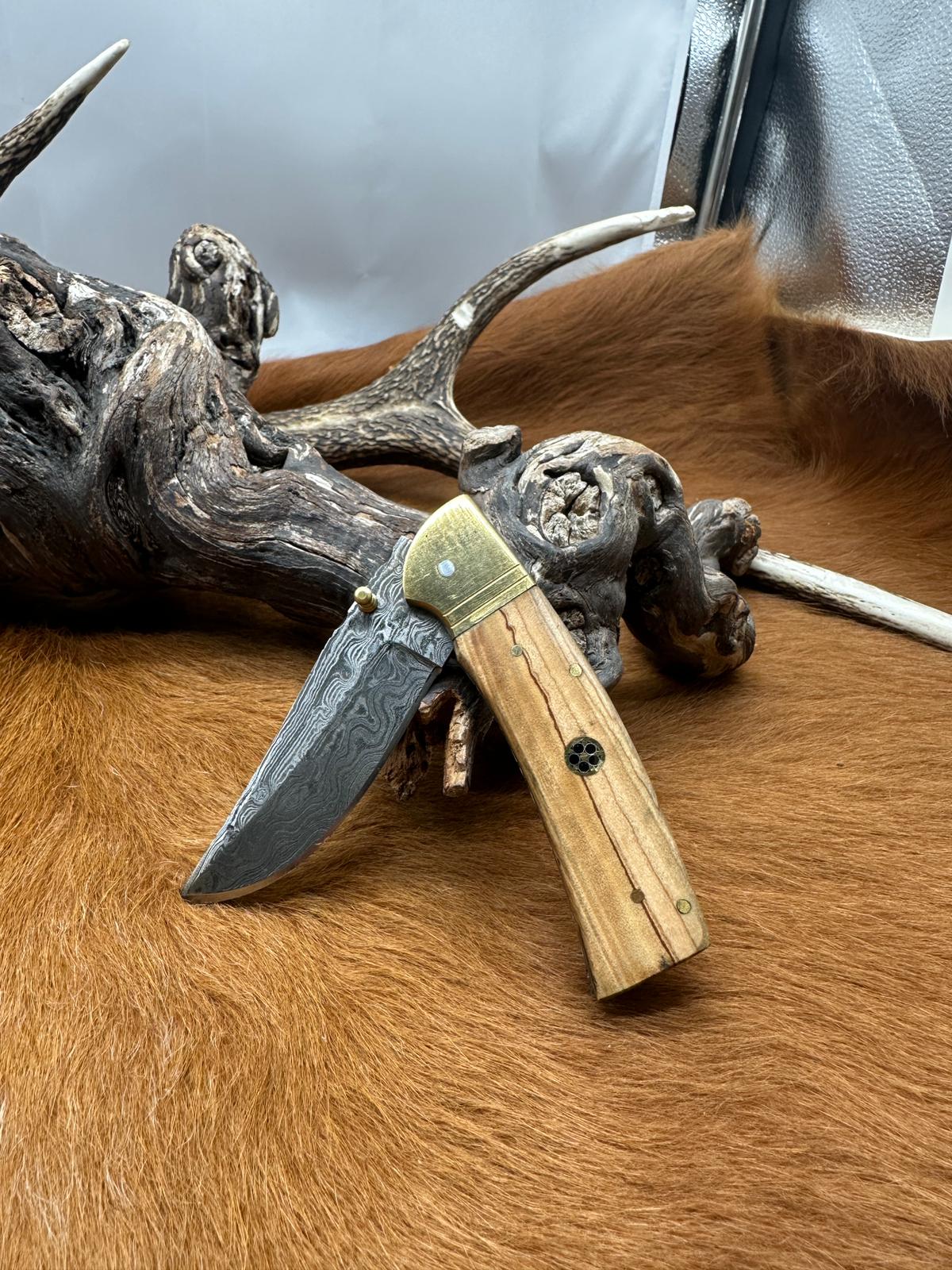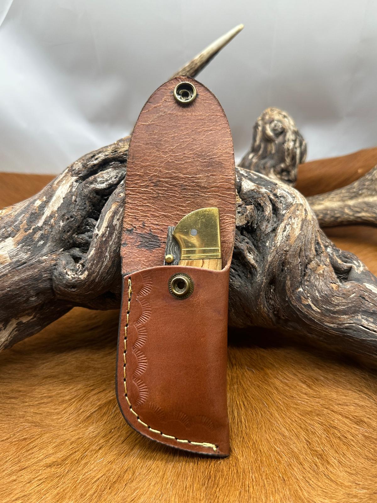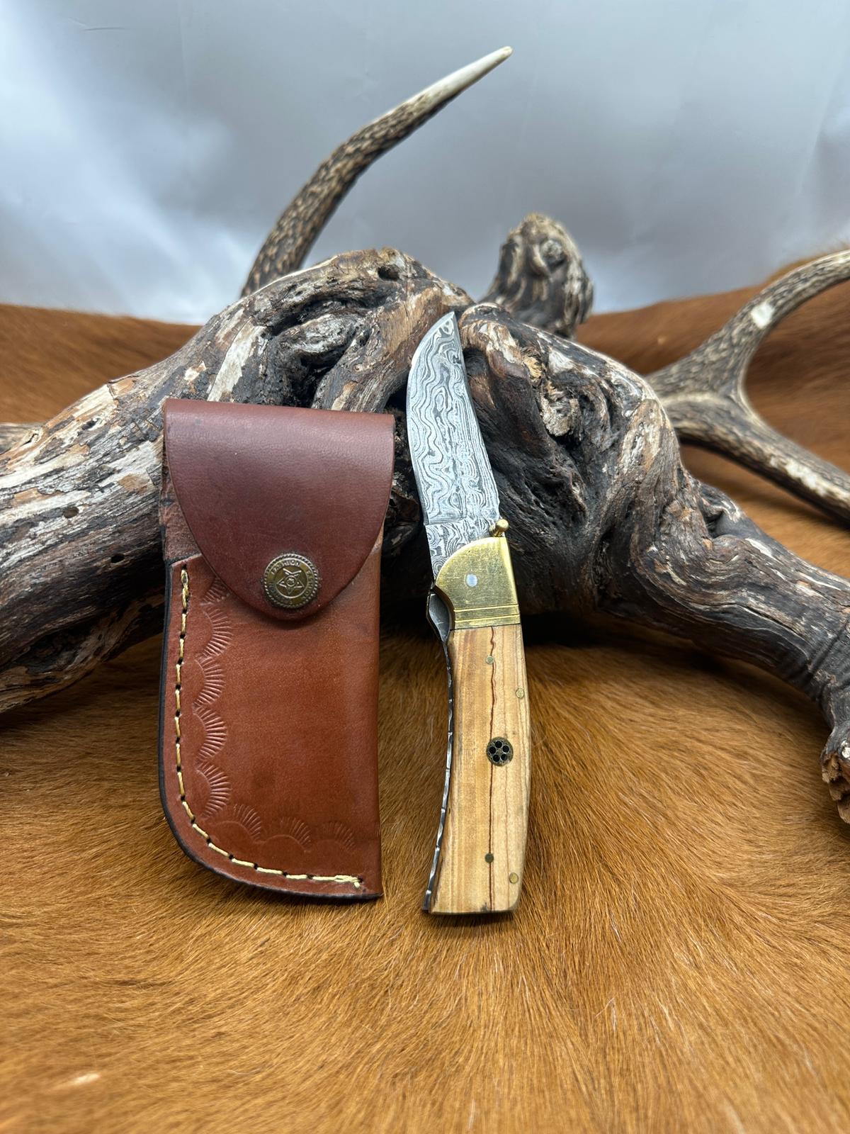 Couteau de Poche Pliant Lame en acier Damas 256couches Manche en Bois d'Olivier Garde en Laiton Taille de la lame 8 cm Taille totales 19 cm Étui en cuir