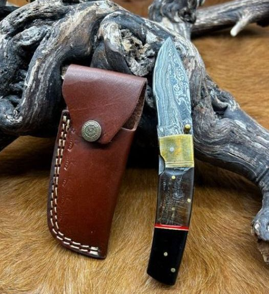 Couteau pliant avec lame de damas 256 couches manche avec plaquette de corne de bélier et de corne du buffle noire, mitre en laiton -Tres belle pièce artisanale - Longueur lame 8cm - Longueur ouvert 18 cm - Lame en damas 256 couches - pièce unique - Cran d'arrêt -etui en cuir de vache -
