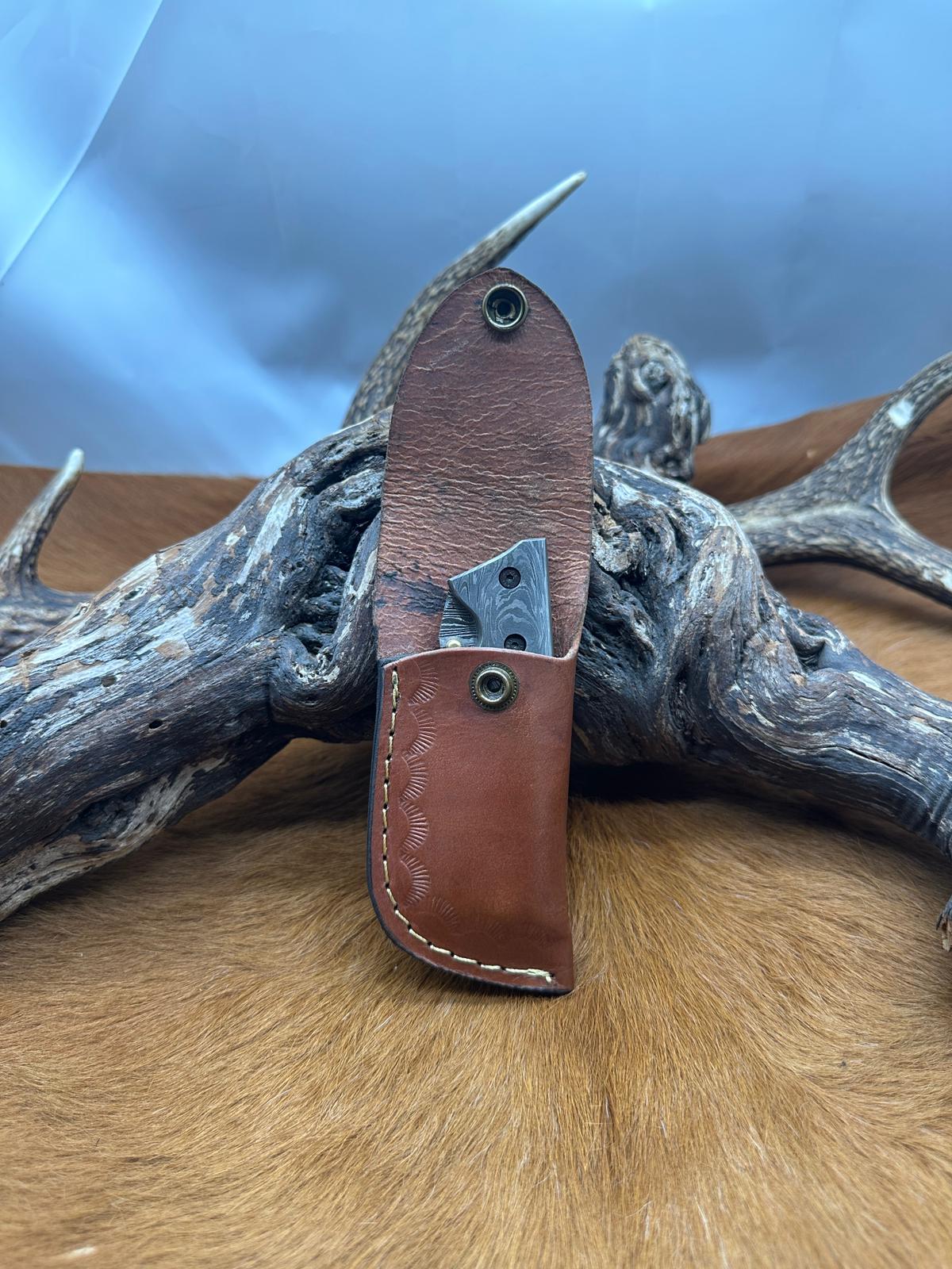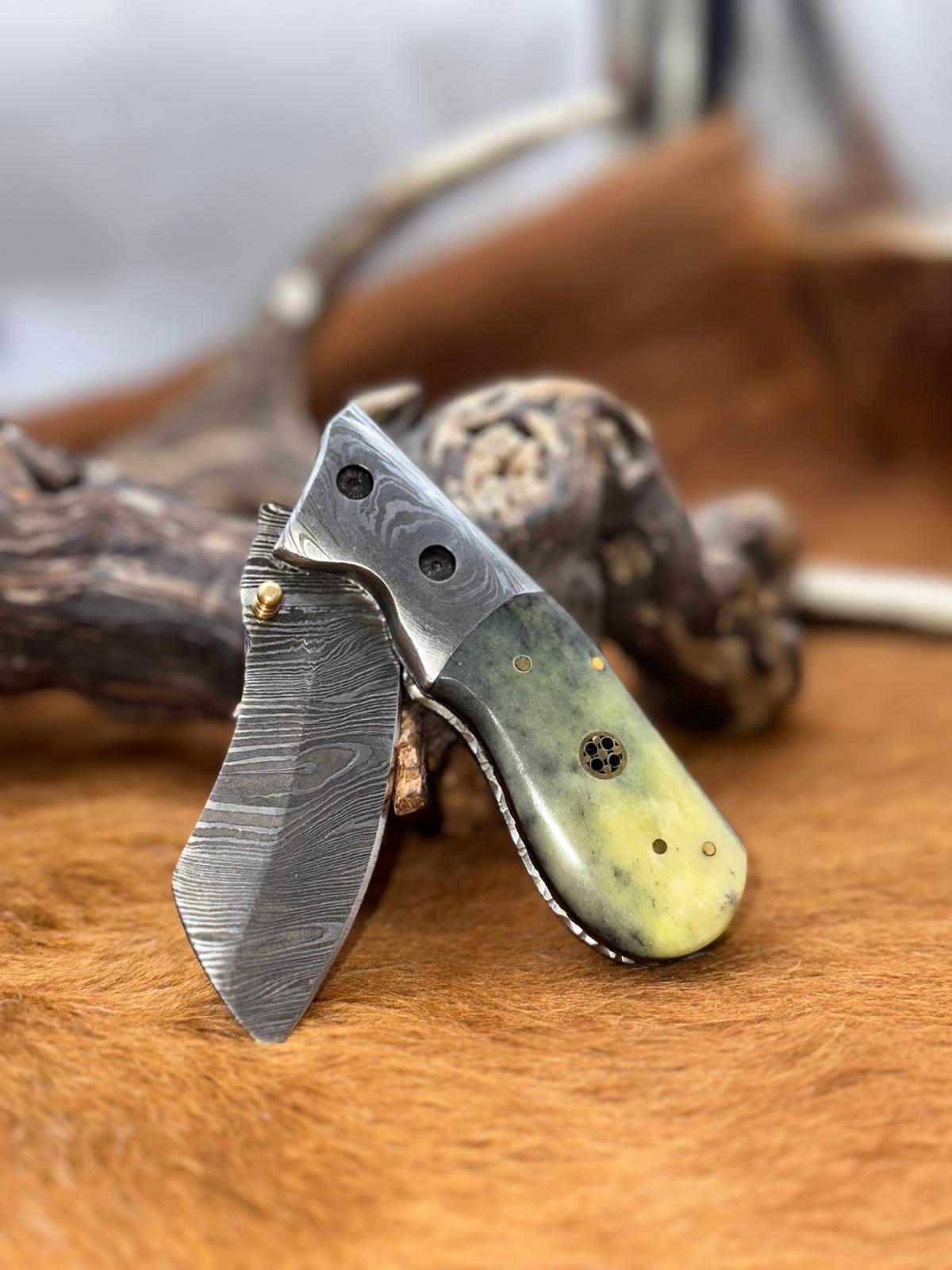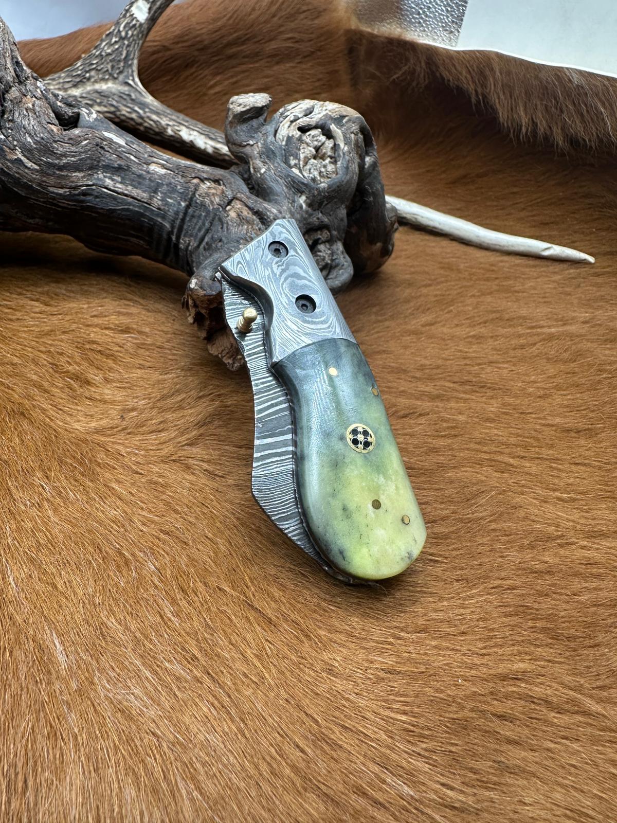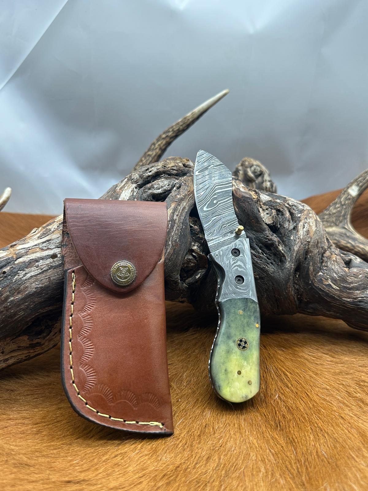 Couteau de Poche Pliant Lame en acier Damas 256couches Manche en Os Vert Garde en Acier Damas Taille de la lame 8 cm Taille totales 18 cm Étui en cuir