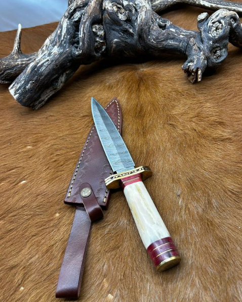 SET DE Magnifique couteau Forgé Main lame acier damas silex GV10 256 Couches, Manche en BOIS DE CERF AVEC UN PETIT COUTEAU DAMAS MANCHE EN BOIS DE CERF OFFERT ref CF01