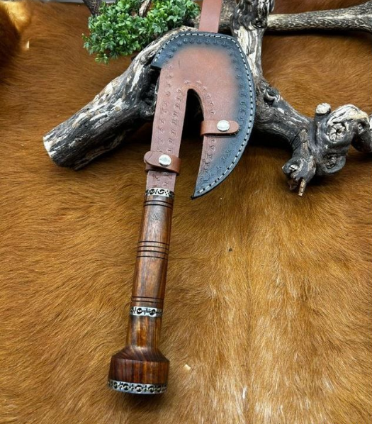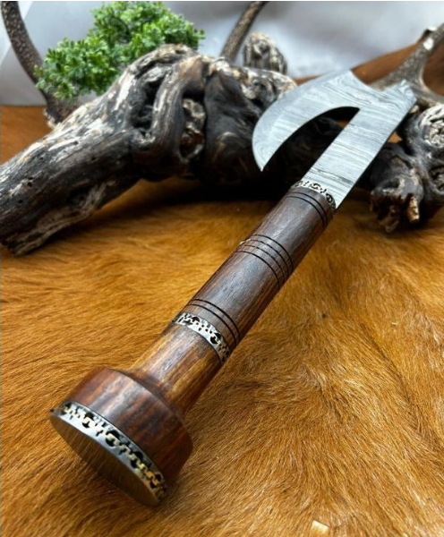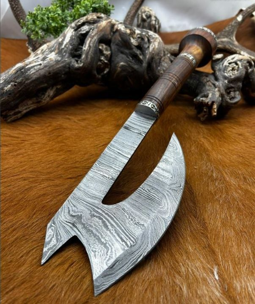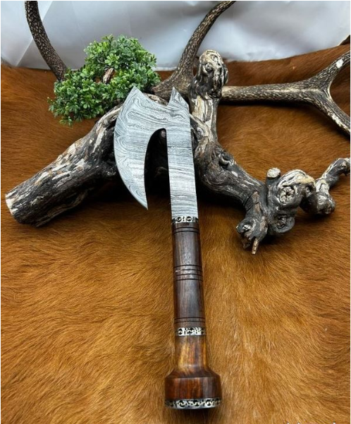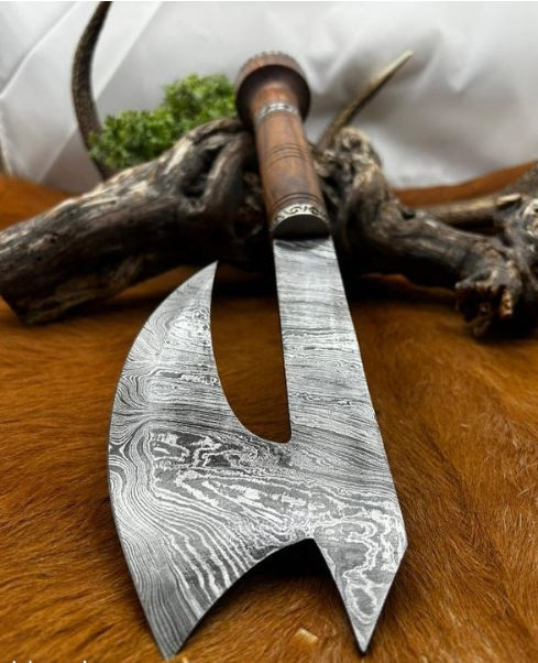 Magnifique hache viking avec une lame en acier damas 512 couches et manche en noyer Longueur totales : 40 cm Longueur de la lame 18 cm vendu avec un etui en cuire
