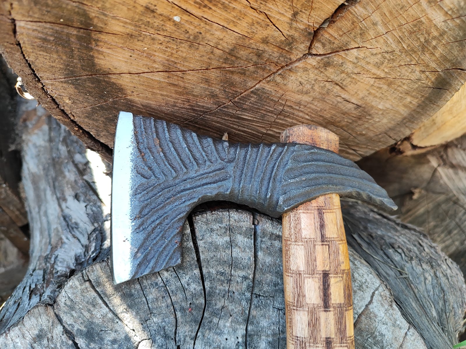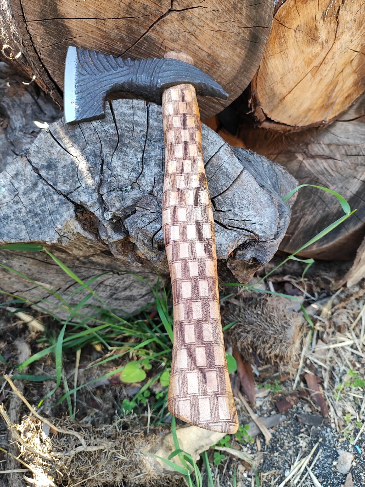 Magnifique Hachette style Viking DE CHEZ RITE EDGE USA Longueur totale de 33.7 cm Tête de hache de 10.8 cm en acier acier carbone 1095C Brute de forge Manche en bois de palissandre Etui de ceinture en cuir marron qui s'attache à la ceinture