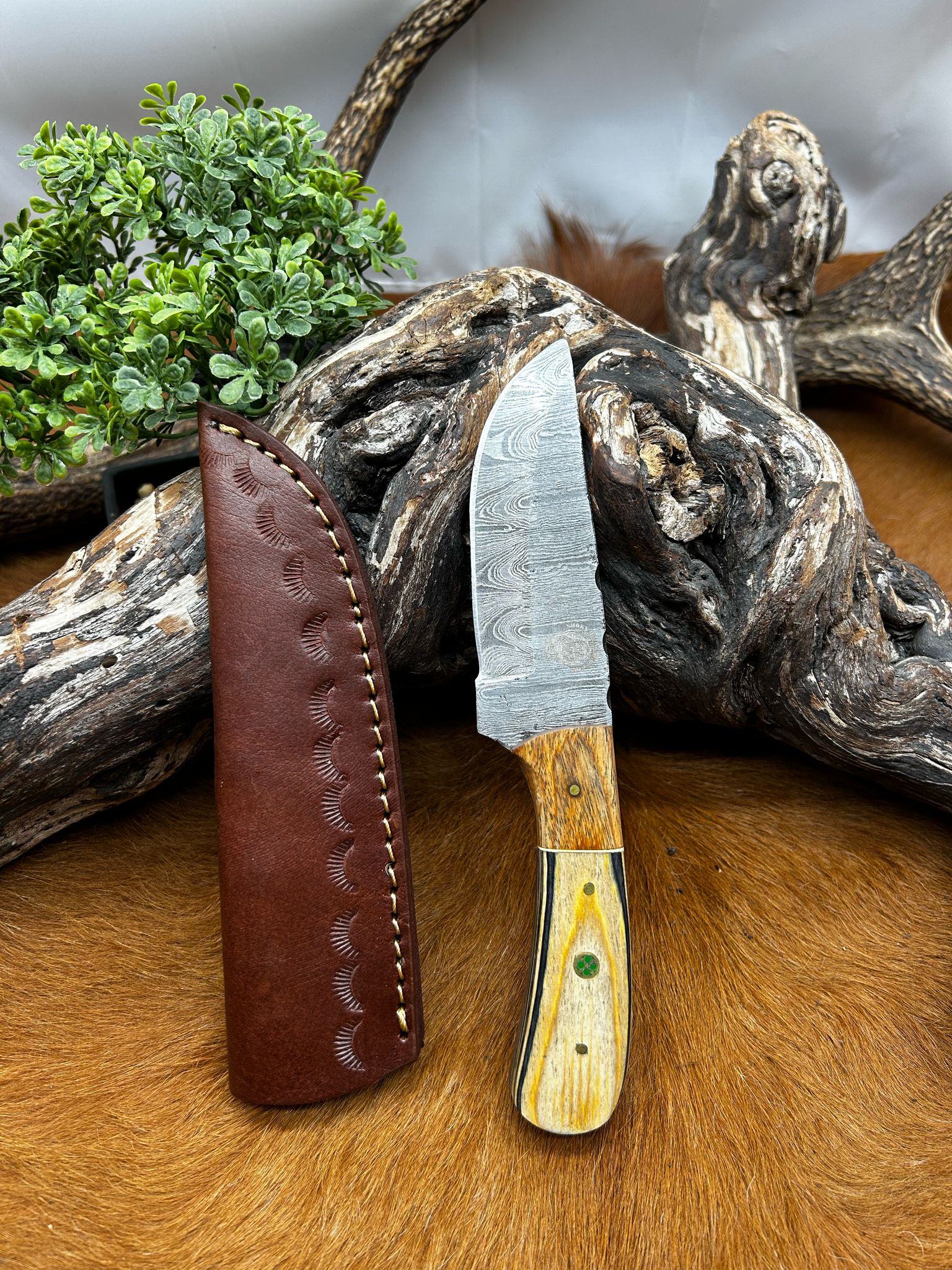 Magnifique couteau smoky Blades Mountain lame en acier Damas 256 couches manche en bois Taille totales 19cm Taille de la lame 9cm Taille du manche 10cm Étui en cuir de vache Vendu dans sa boîte
