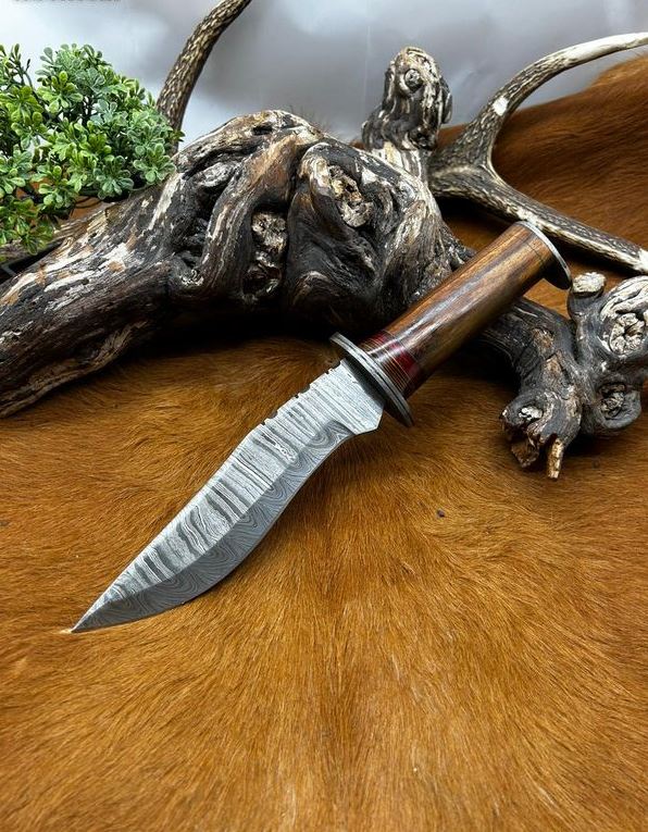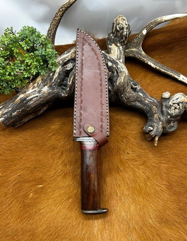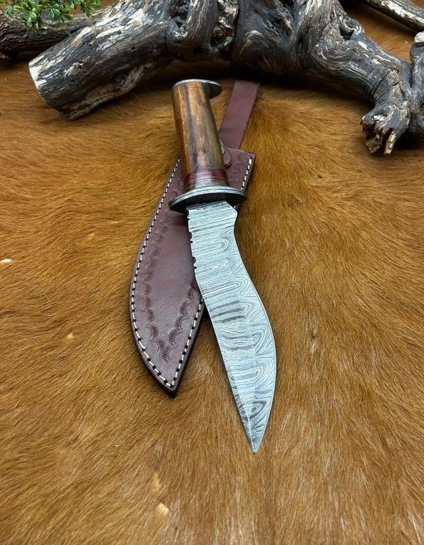 MAGNIFIQUE COUTEAU de chez RITE EDGE EN ACIER DAMAS MANCHE EN NOYER TAILLE TOTALE: 31 CM TAILLE DE LA LAME : 19 CM ETUI EN CUIR