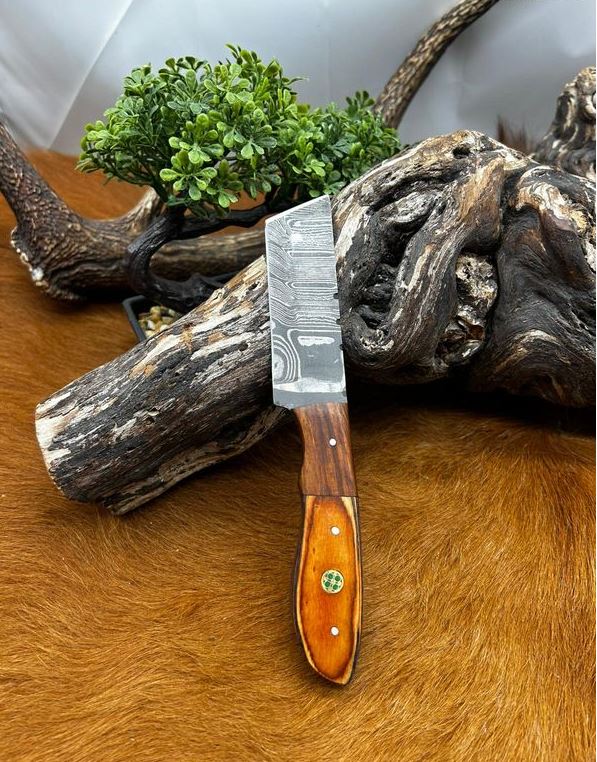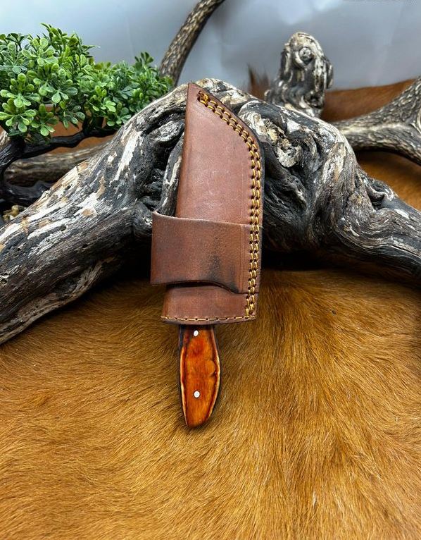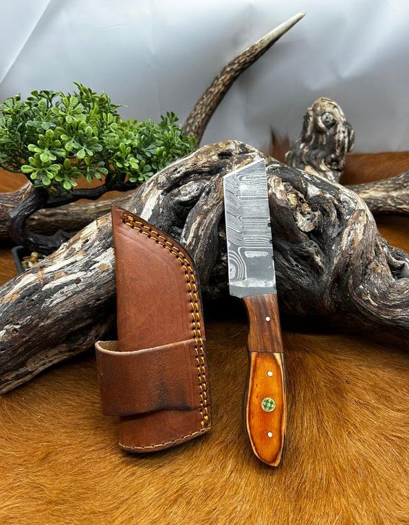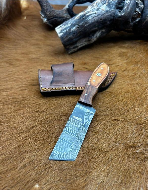 couteau lame Tonto en acier damas etui en cuire 256 couches manche en bois taille de la lame : 9 cm taille totales: 20cm etui en cuire