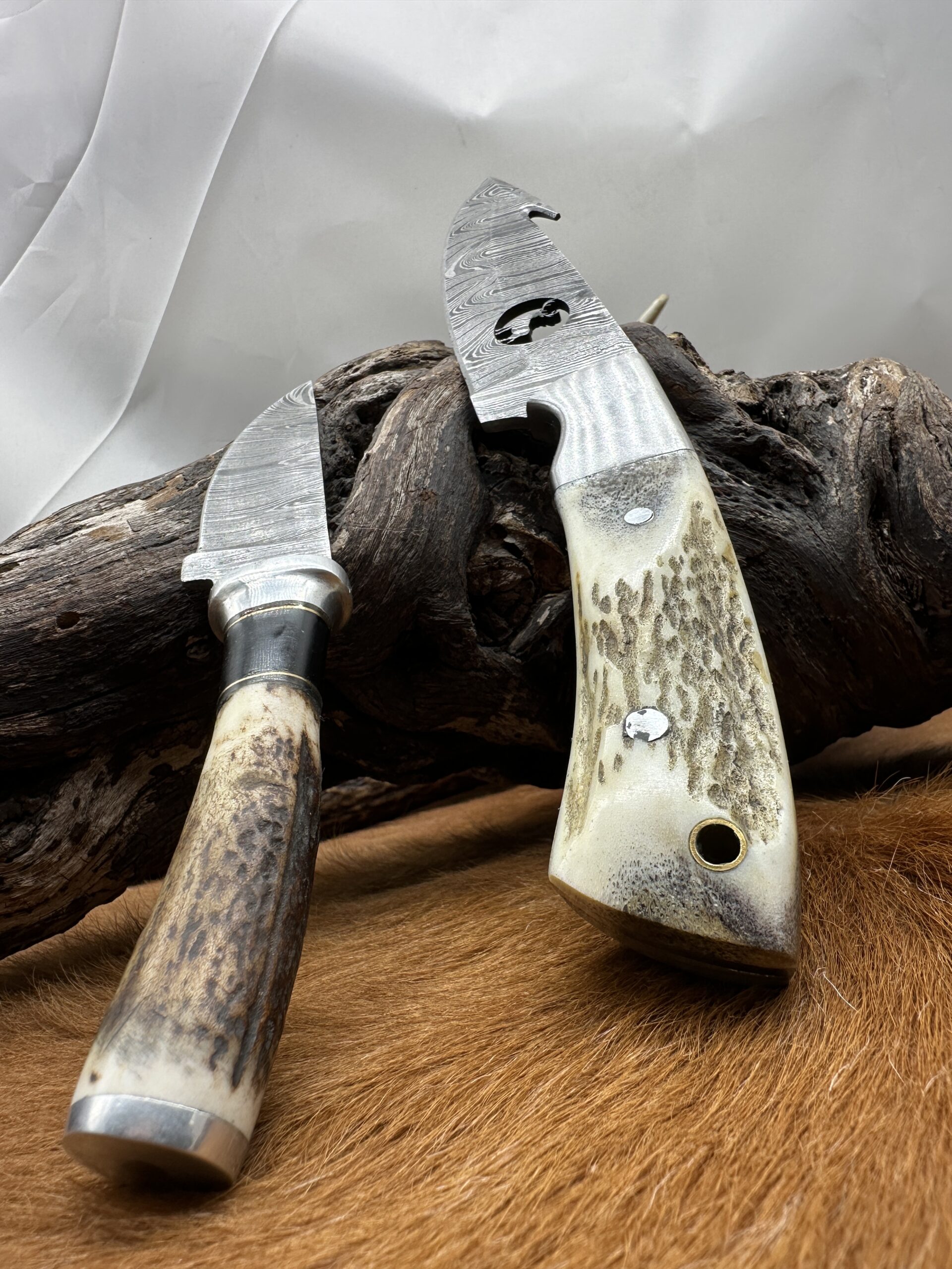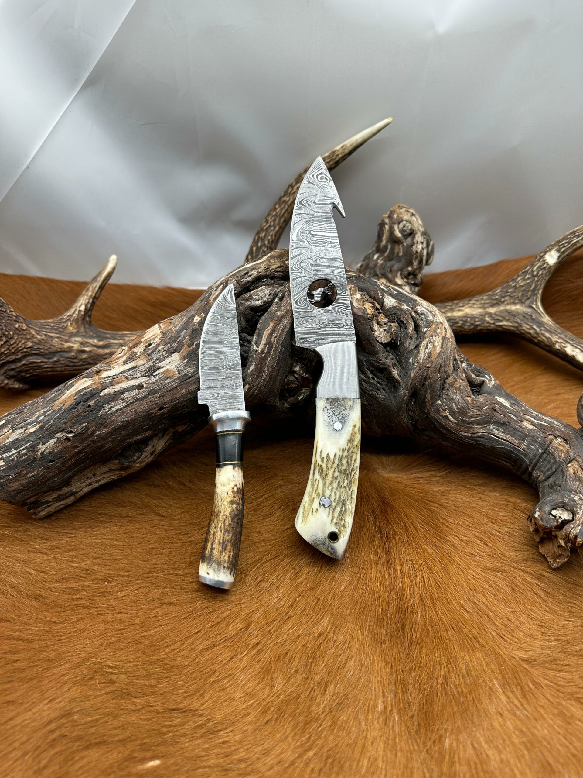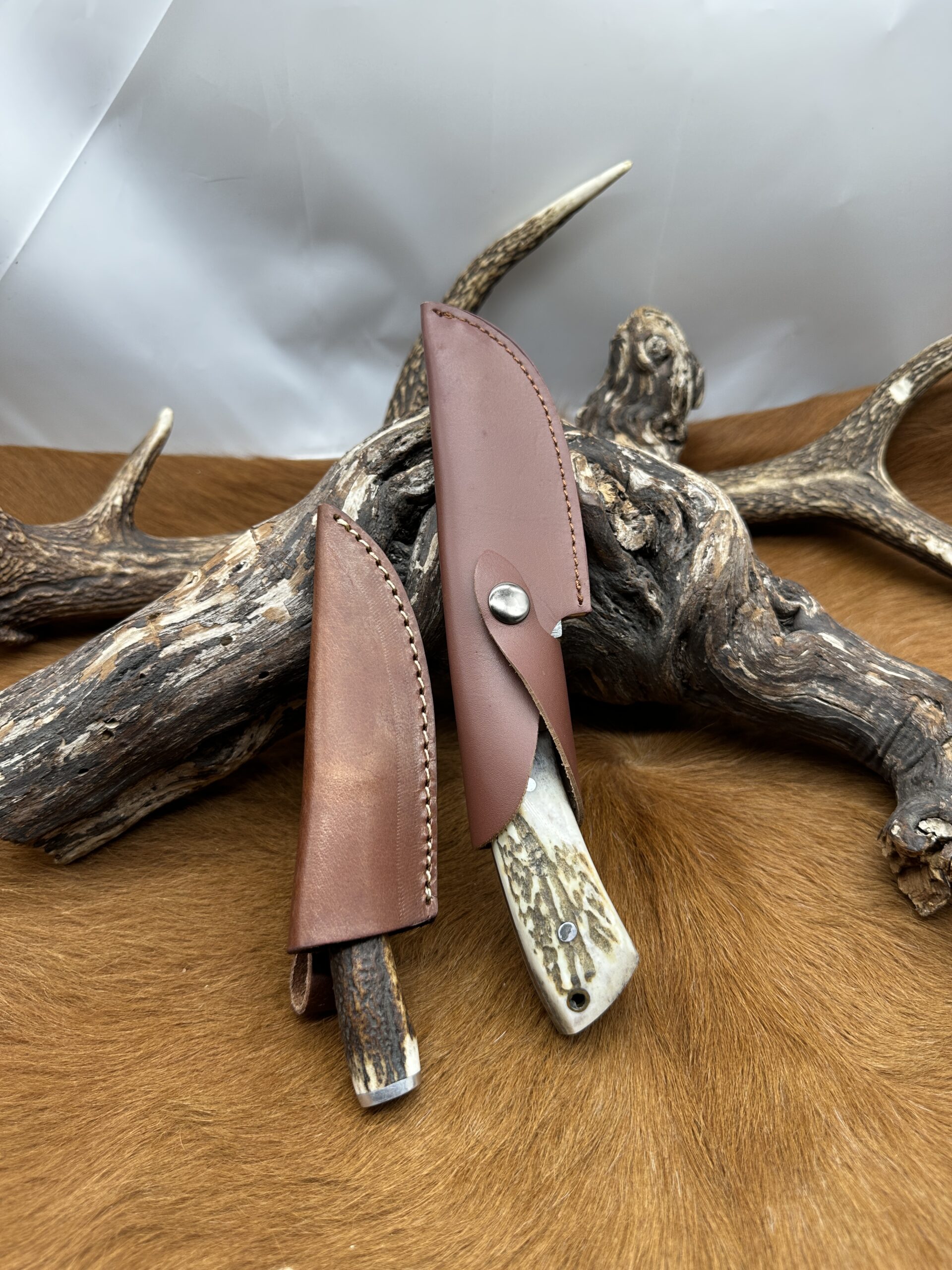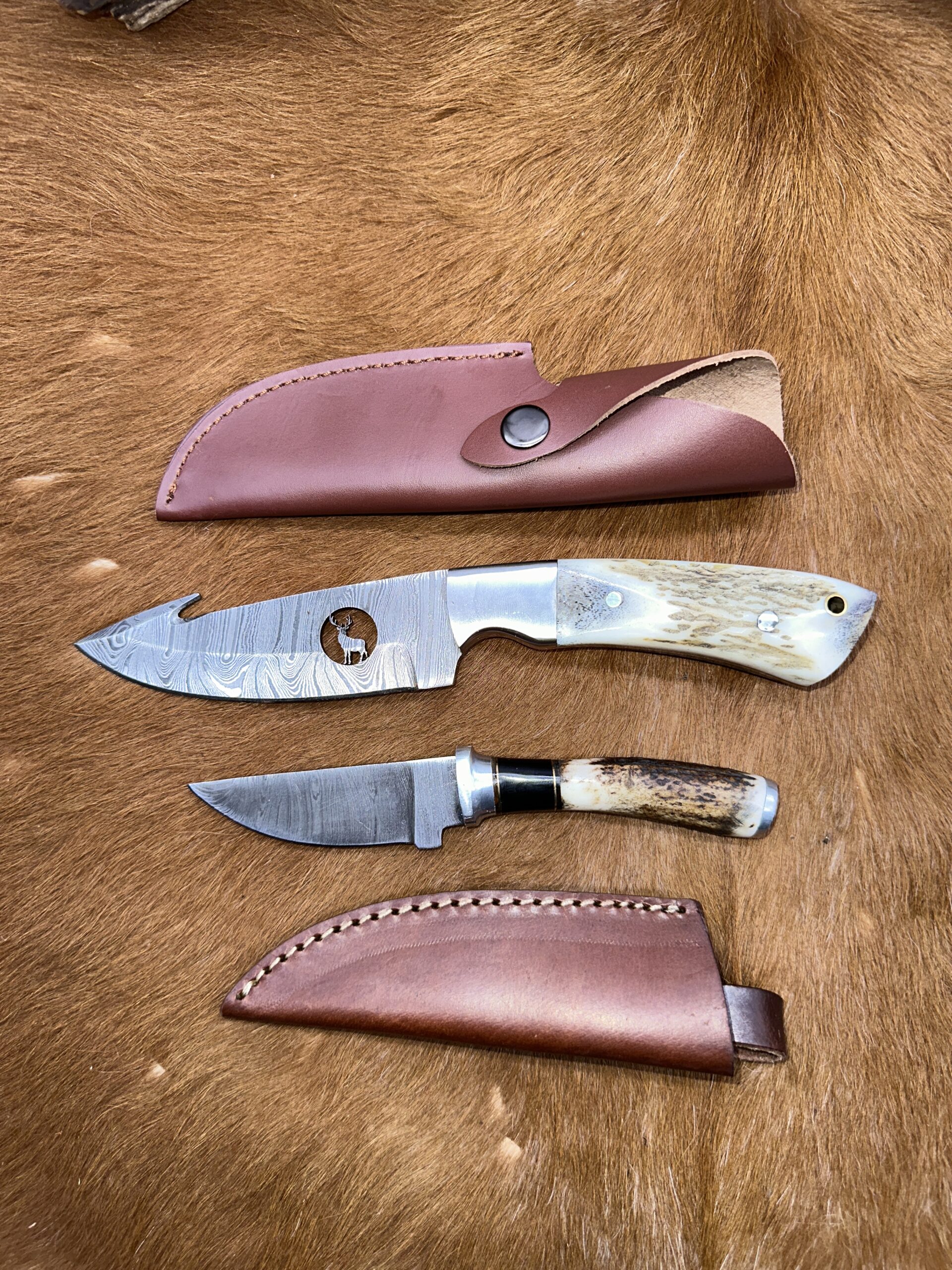 Set couteau Skinner “The HUNTER” avec mini-couteau : Manche en bois de Cerf avec étui en Cuir ref cd30