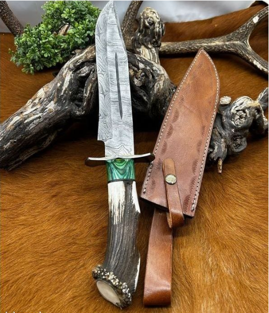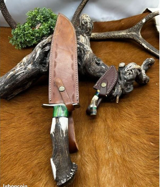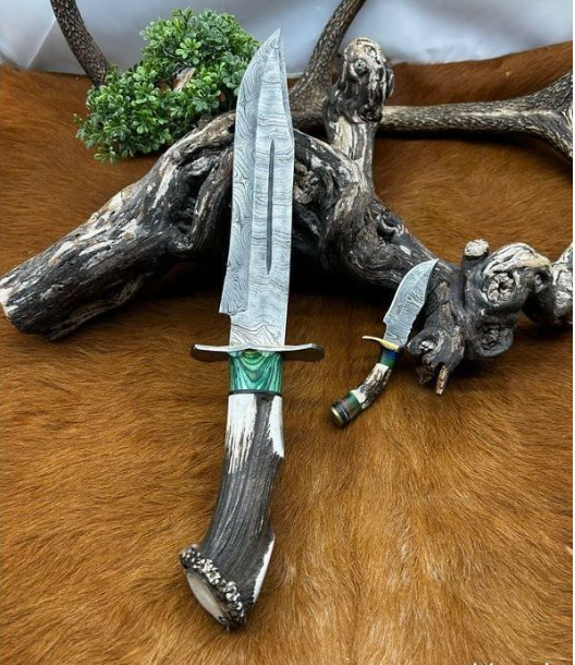 SET DE Bowie Unique lame ACIER DAMAS VG10 256couches Manche en BOIS DE CERF VERITABLE ARTISANAL (VERT)+ PETIT COUTEAU DAMAS MANCHE EN BOIS DE CERF OFFERT ref VG10V