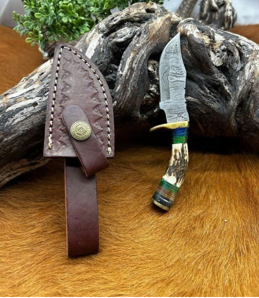 petit couteau lame damas 256 couches de 8 cm avec un manche en bois de cerf avec garde en laiton de 15 cm vendu avec son etui