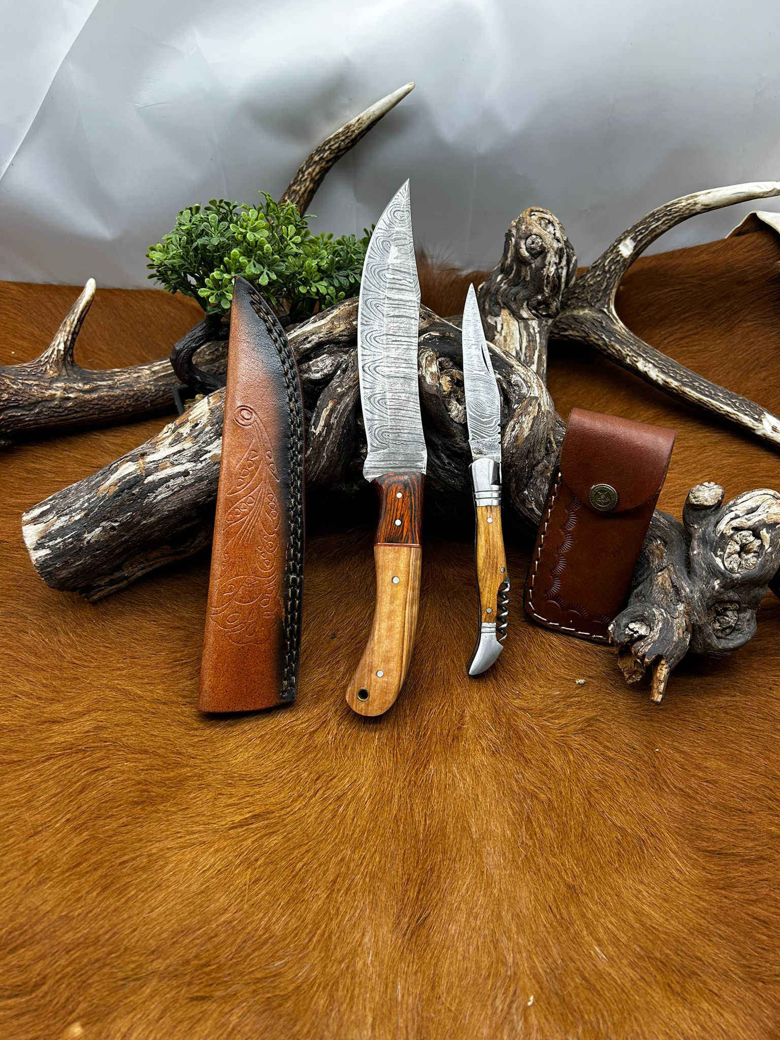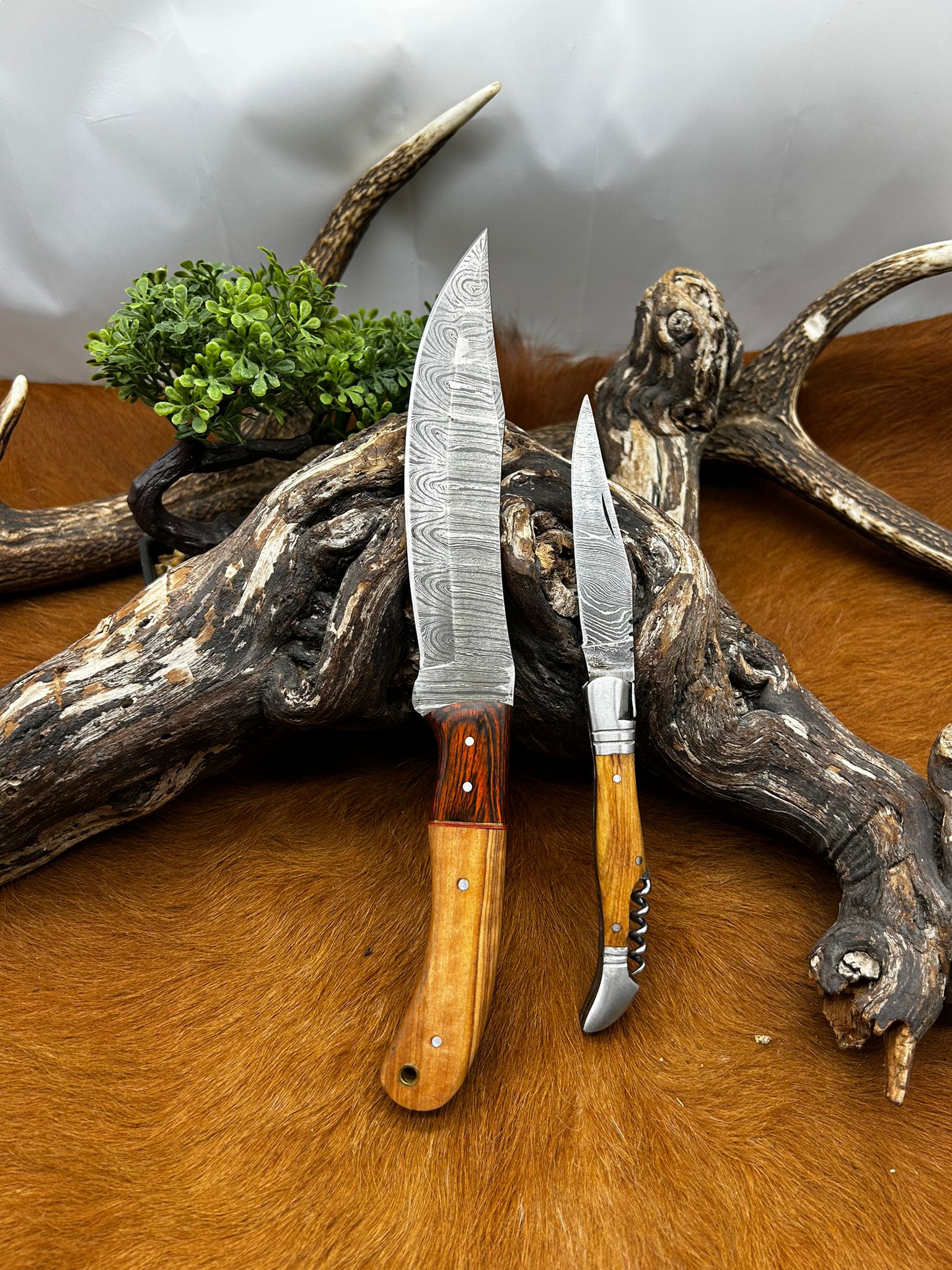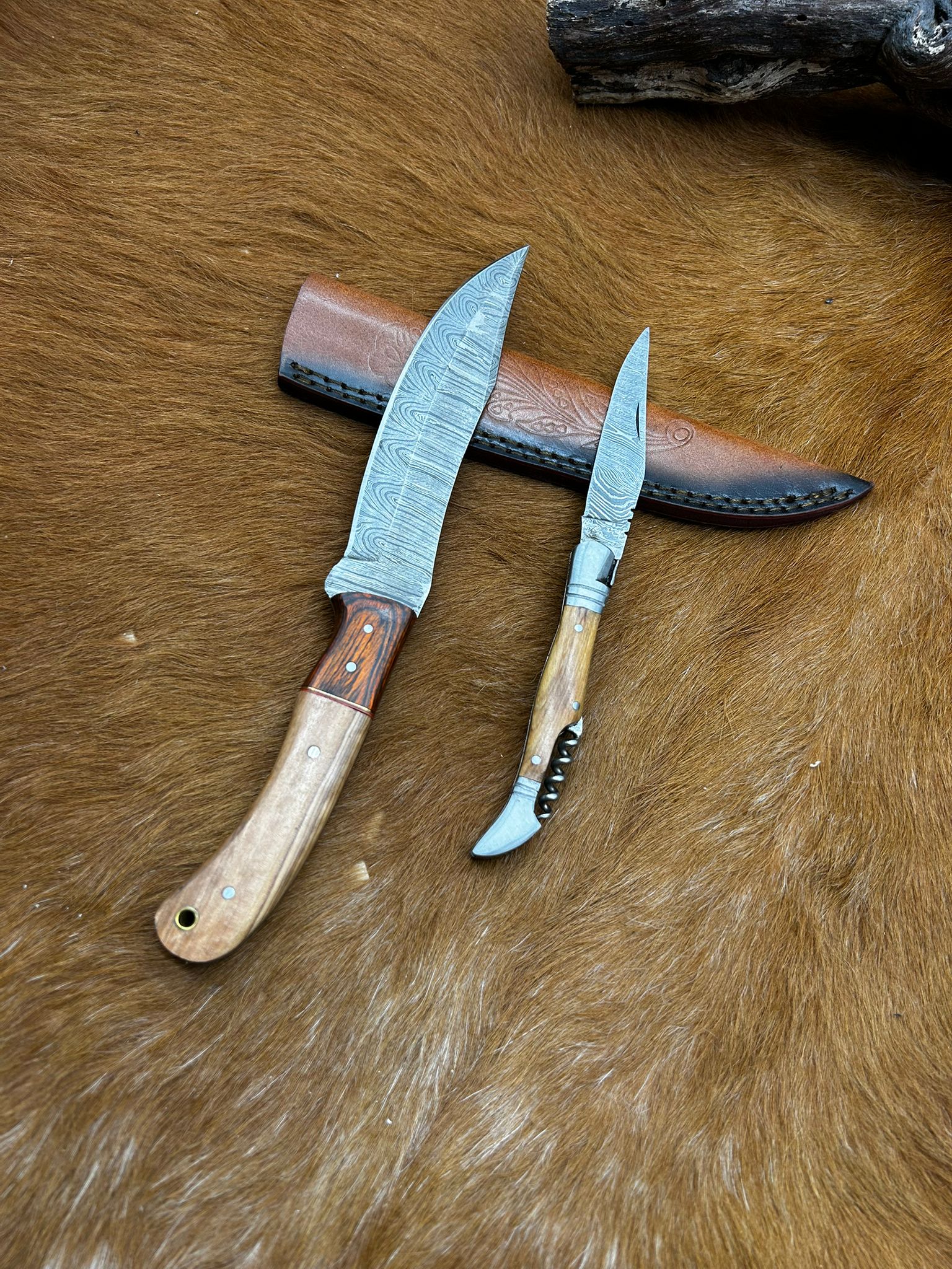 FABRICATION ARTISANAL MANCHE EN : Manche en Bois d'olivier Étui en cuir de vache taille totale : 29 cm taille de lame : 16cm couteau de poche lame en acier damas 256 couches manche en bois d'olivier avec tire bouchon taille ouvert : 22 cm taille fermer : 12 cm avec etui en cuire