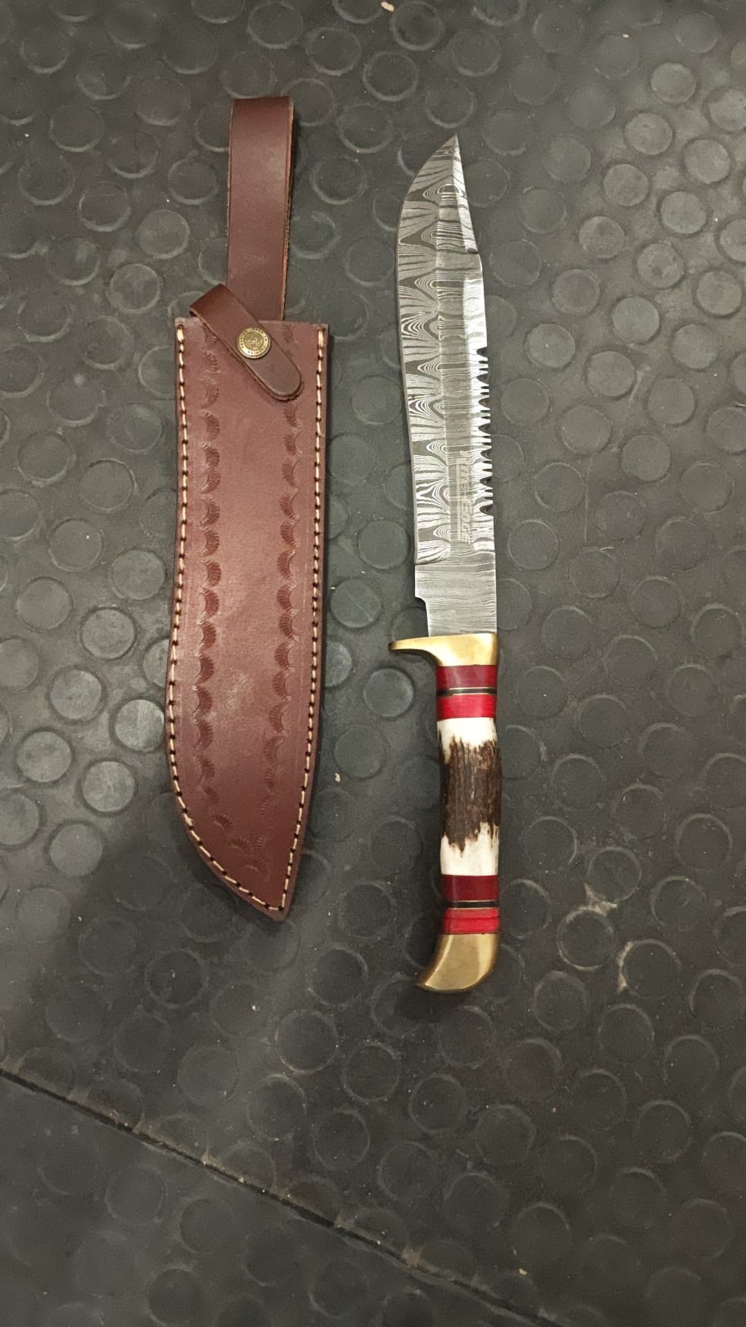 Le couteau est livré avec un étui en cuir épais, cousu à la main et décoré sur la tranche. Il assure une protection optimale de la lame et permet un port sécurisé à la ceinture, idéal pour le transport et le rangement.