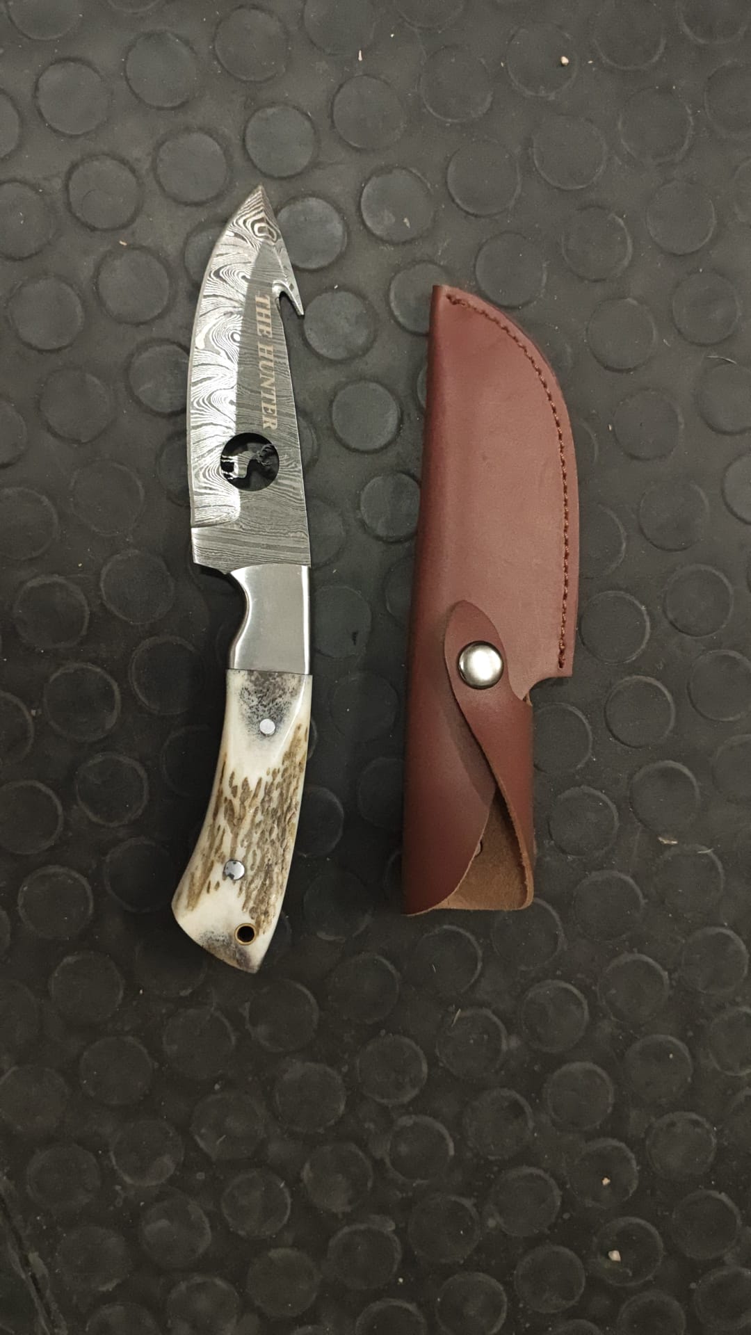 La lame est fabriquée en acier damassé, révélant des motifs ondulés uniques qui témoignent d’un véritable travail de forge. L’ouverture ajourée dans la lame apporte à la fois un allègement, une meilleure maniabilité et une signature visuelle distinctive. Le marquage Hunter renforce son identité fonctionnelle et robuste.