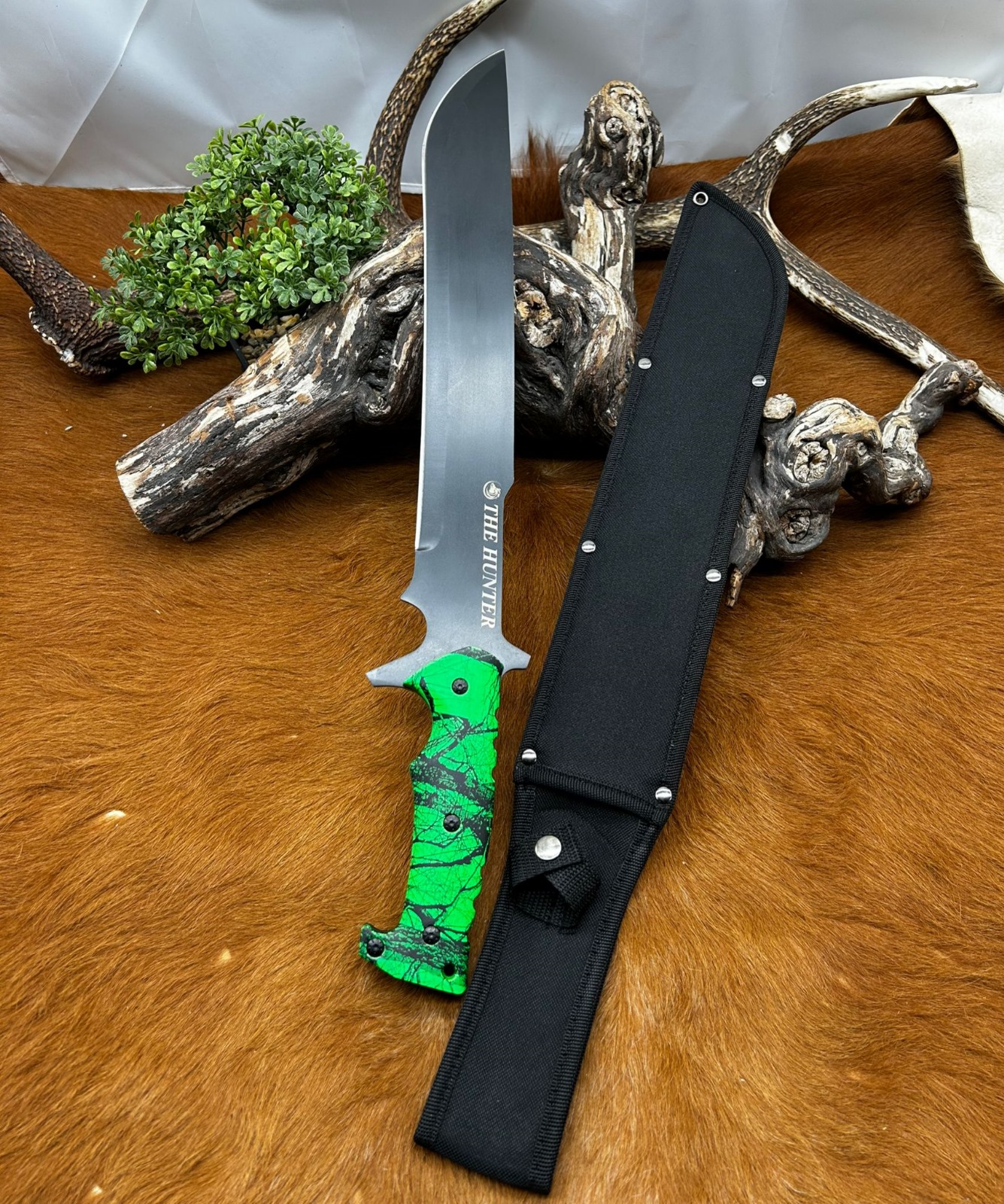 La lame est large, épaisse et robuste, pensée pour encaisser les usages les plus exigeants. Sa forme droite avec pointe marquée permet aussi bien la coupe franche, le débroussaillage, que les travaux lourds en milieu naturel. La finition sombre apporte un aspect tactique et moderne, tout en limitant les reflets. Le marquage The Hunter souligne sa vocation orientée chasse et outdoor.